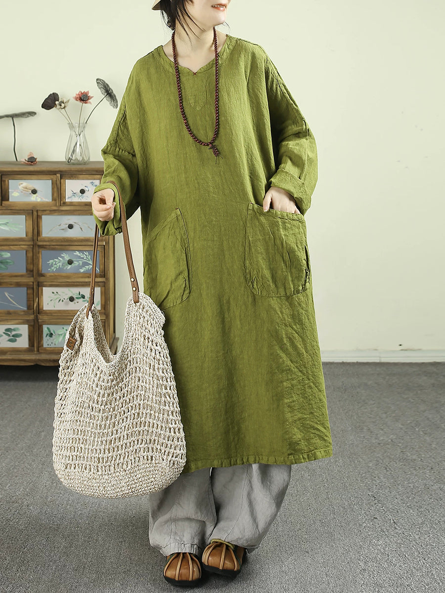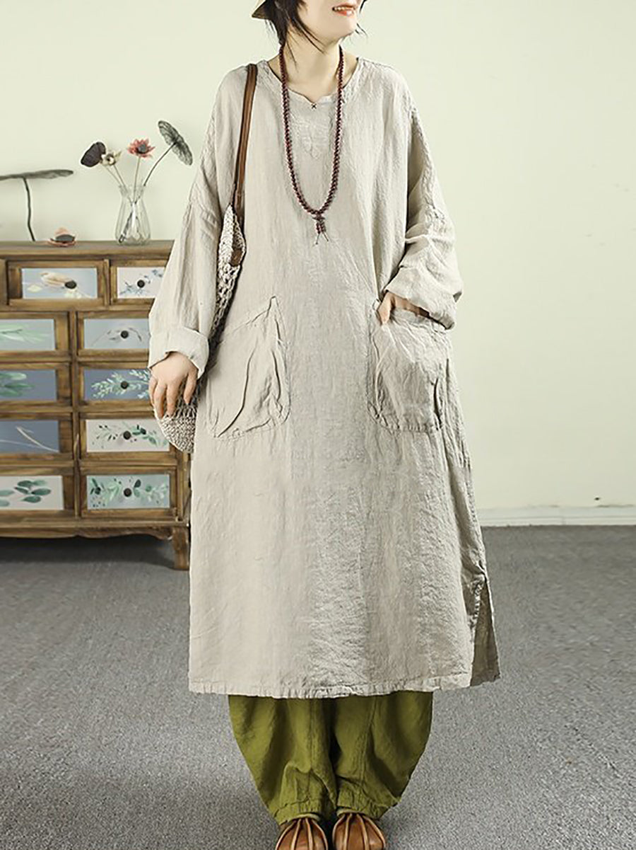 Vestido feminino retrô de primavera, cor lisa, 100% linho, com decote redondo.