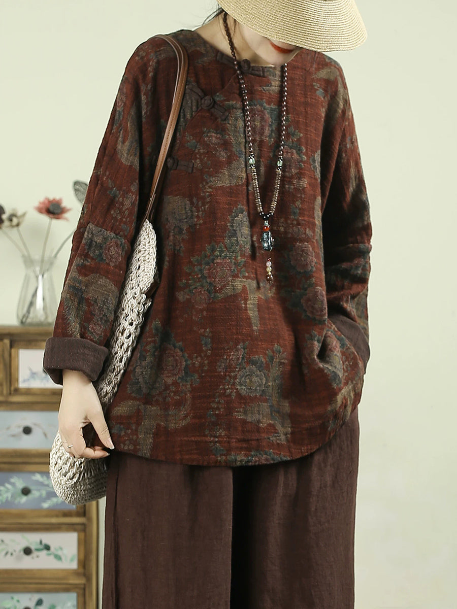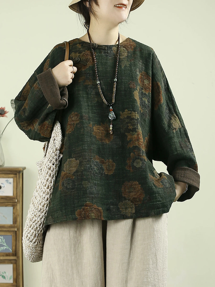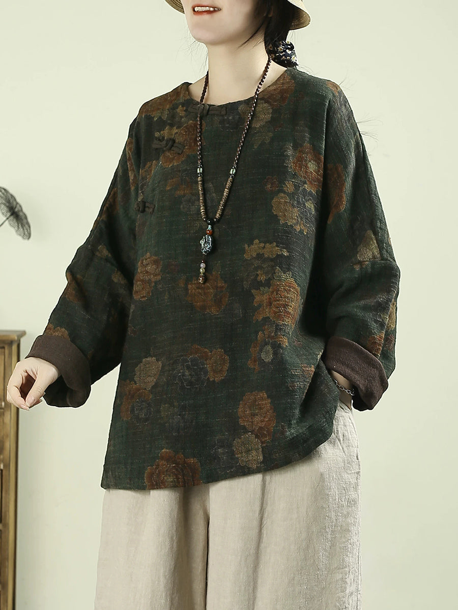 Blusa feminina vintage de linho com estampa floral e decote redondo, ideal para a primavera.
