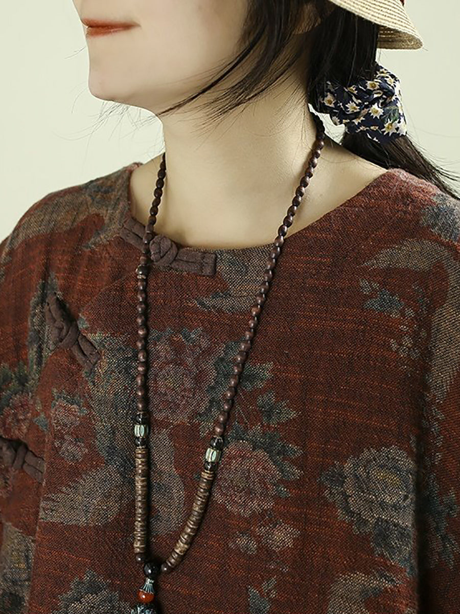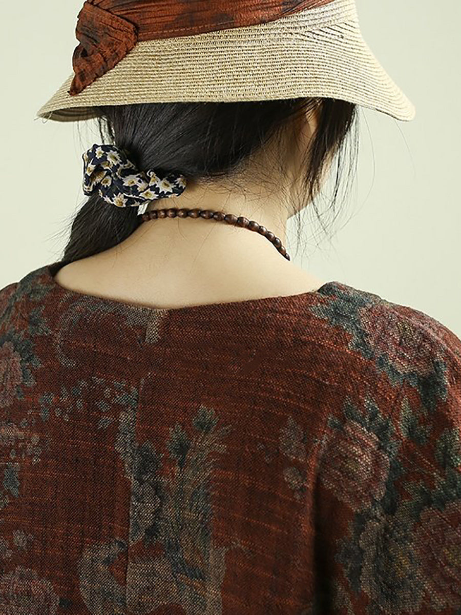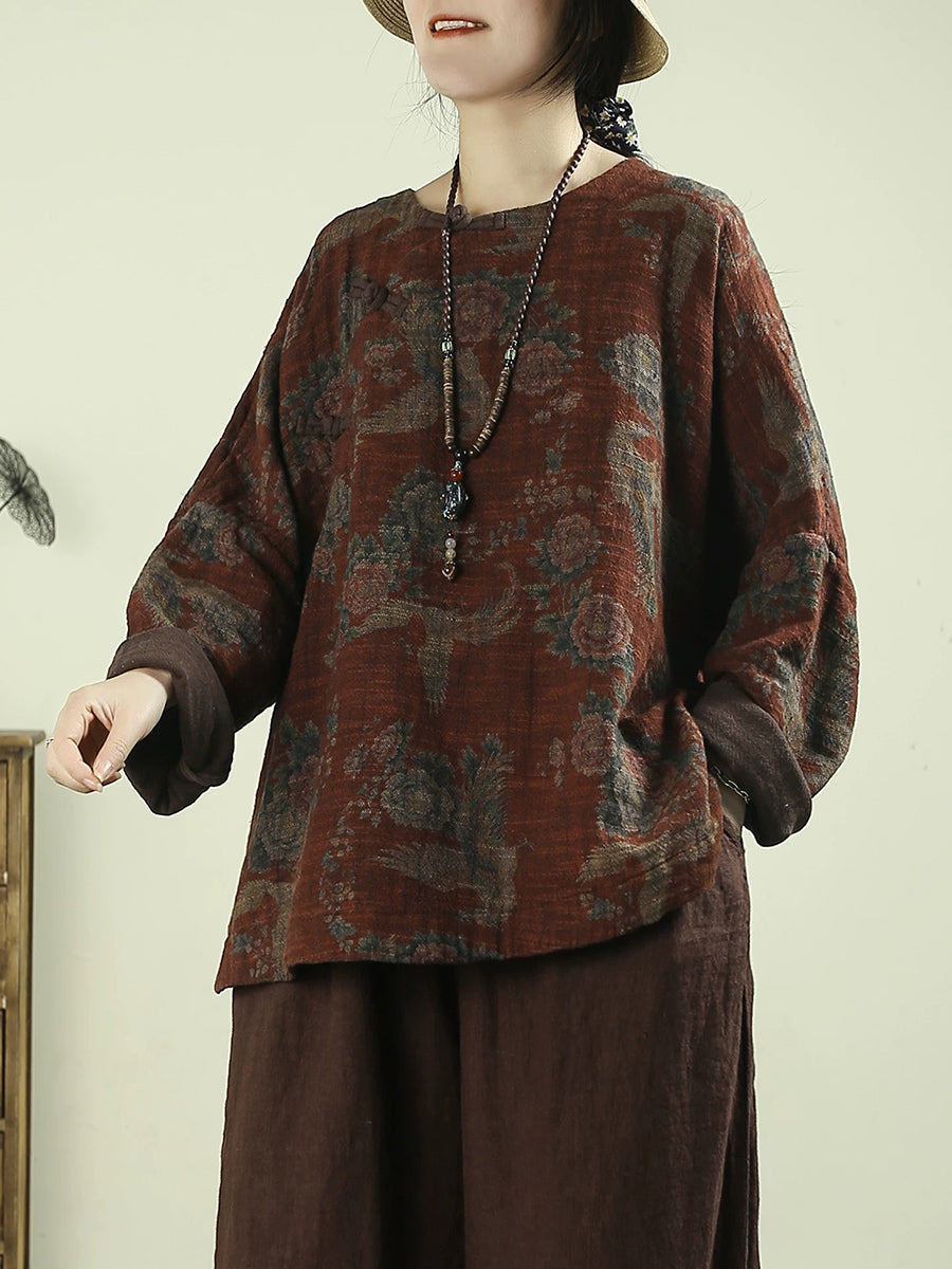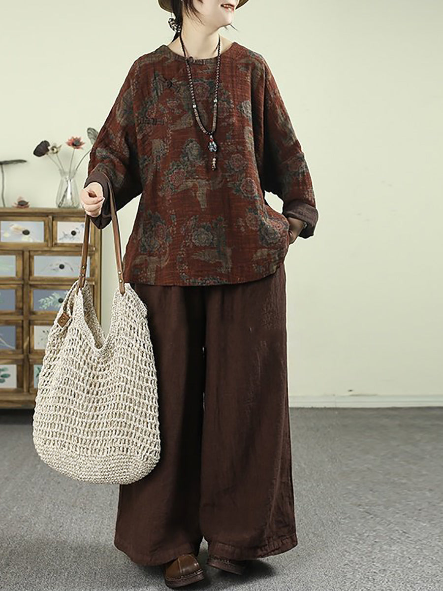 Blusa feminina vintage de linho com estampa floral e decote redondo, ideal para a primavera.