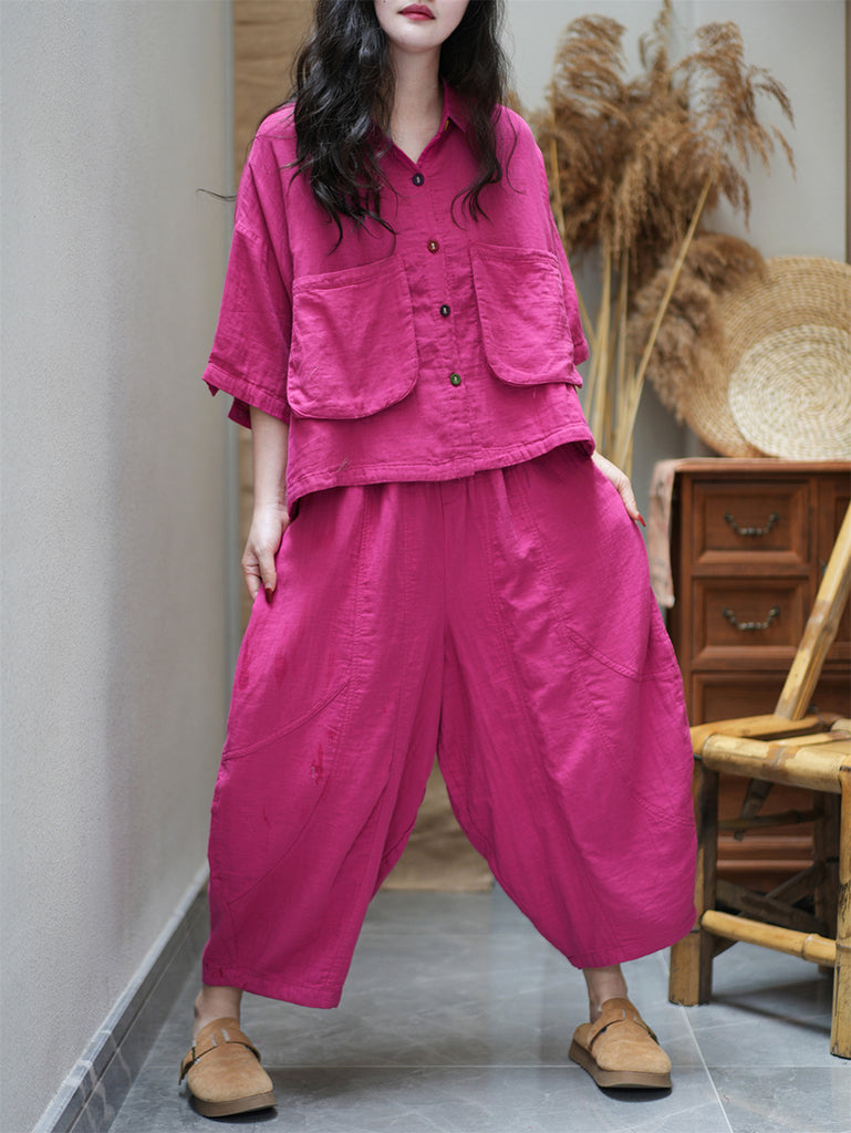 Camisa feminina plus size vintage de algodão de linho sólido + calça