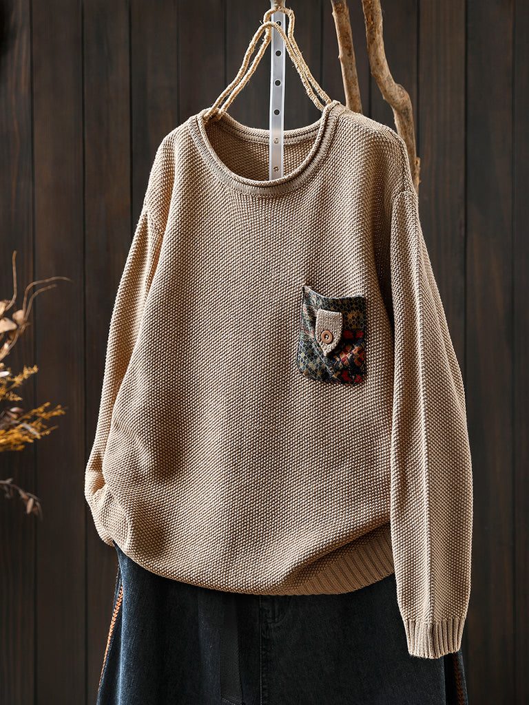 Suéter feminino de malha com bolsos bordados e gola redonda para outono