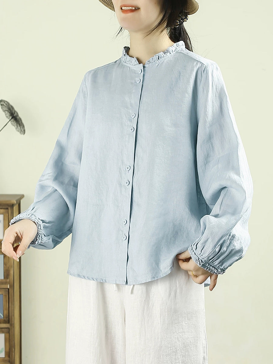 Camisa feminina Artsy Spring de cor lisa com gola alta, 100% linho.