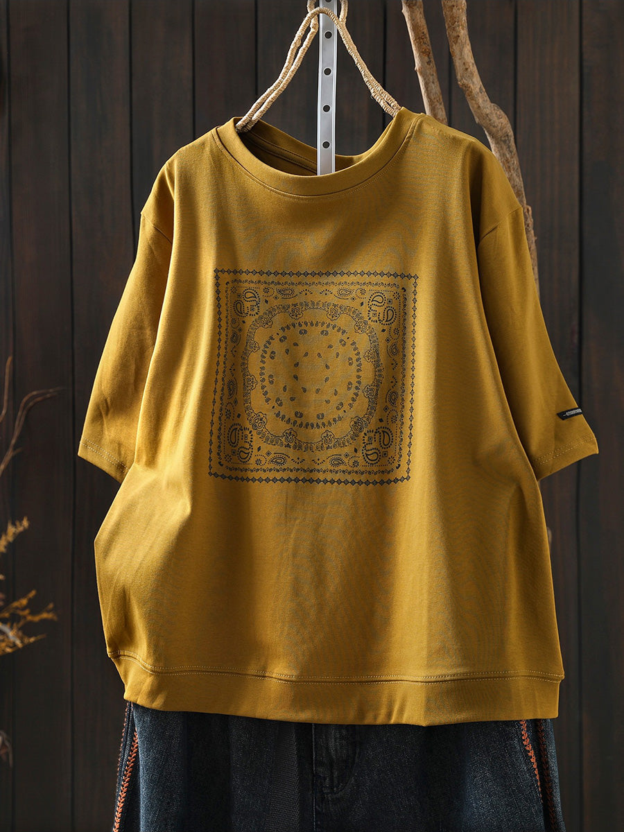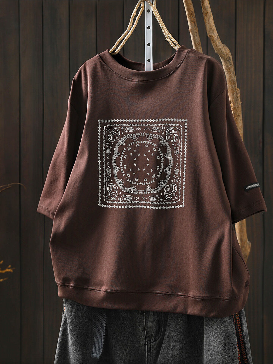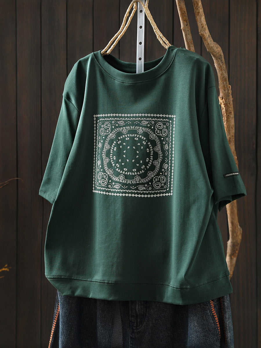 Camisa feminina de verão artística em algodão com decote redondo