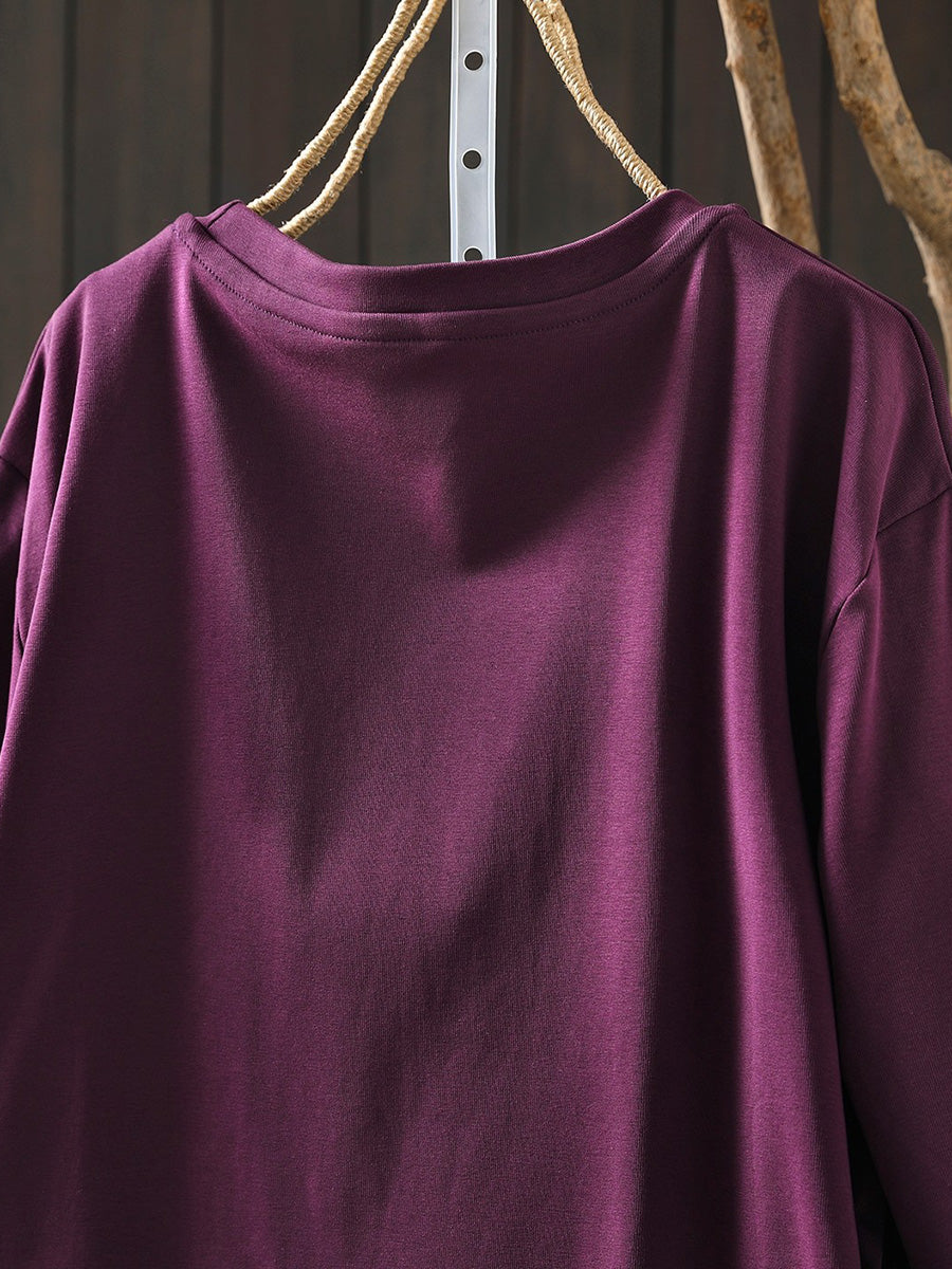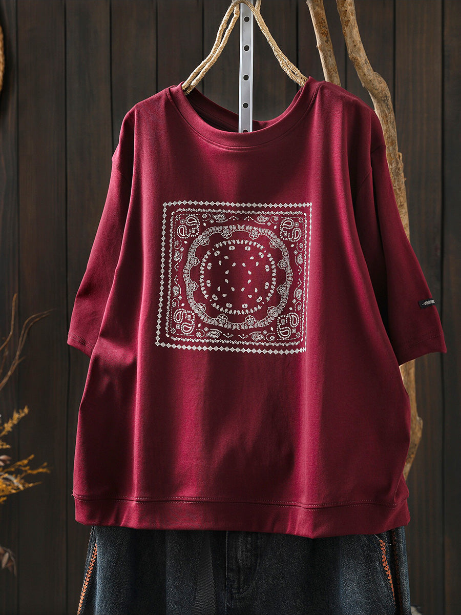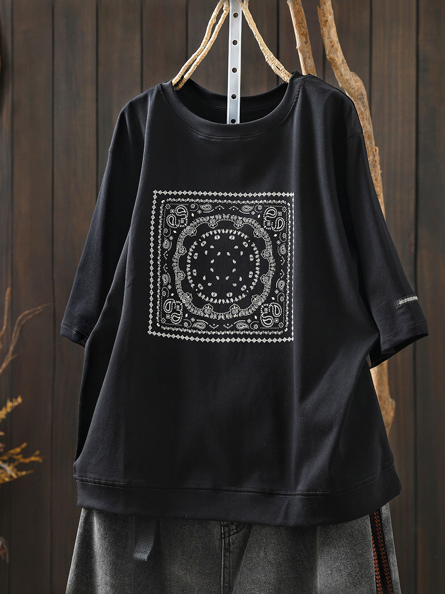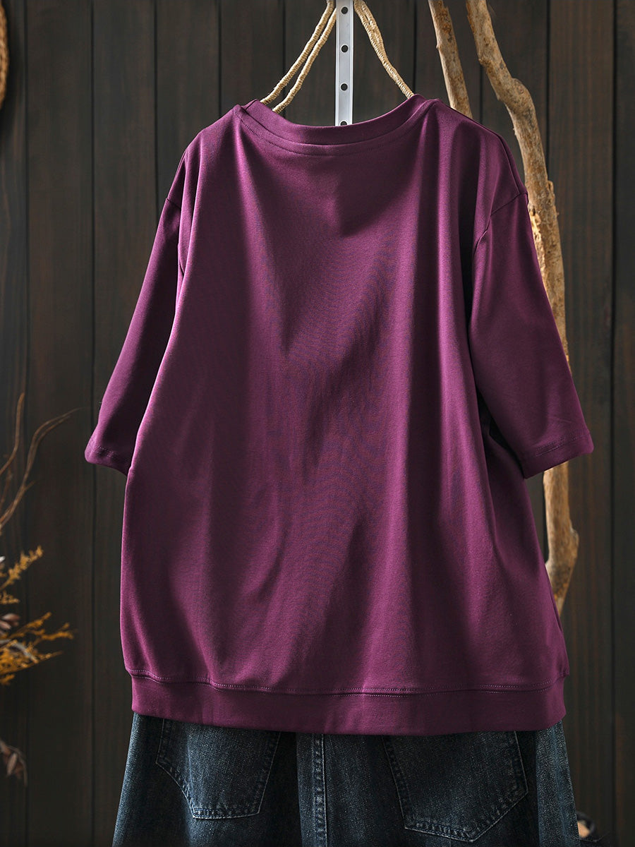 Camisa feminina de verão artística em algodão com decote redondo