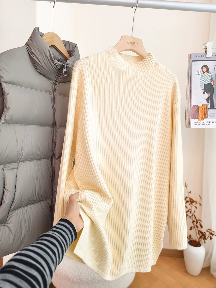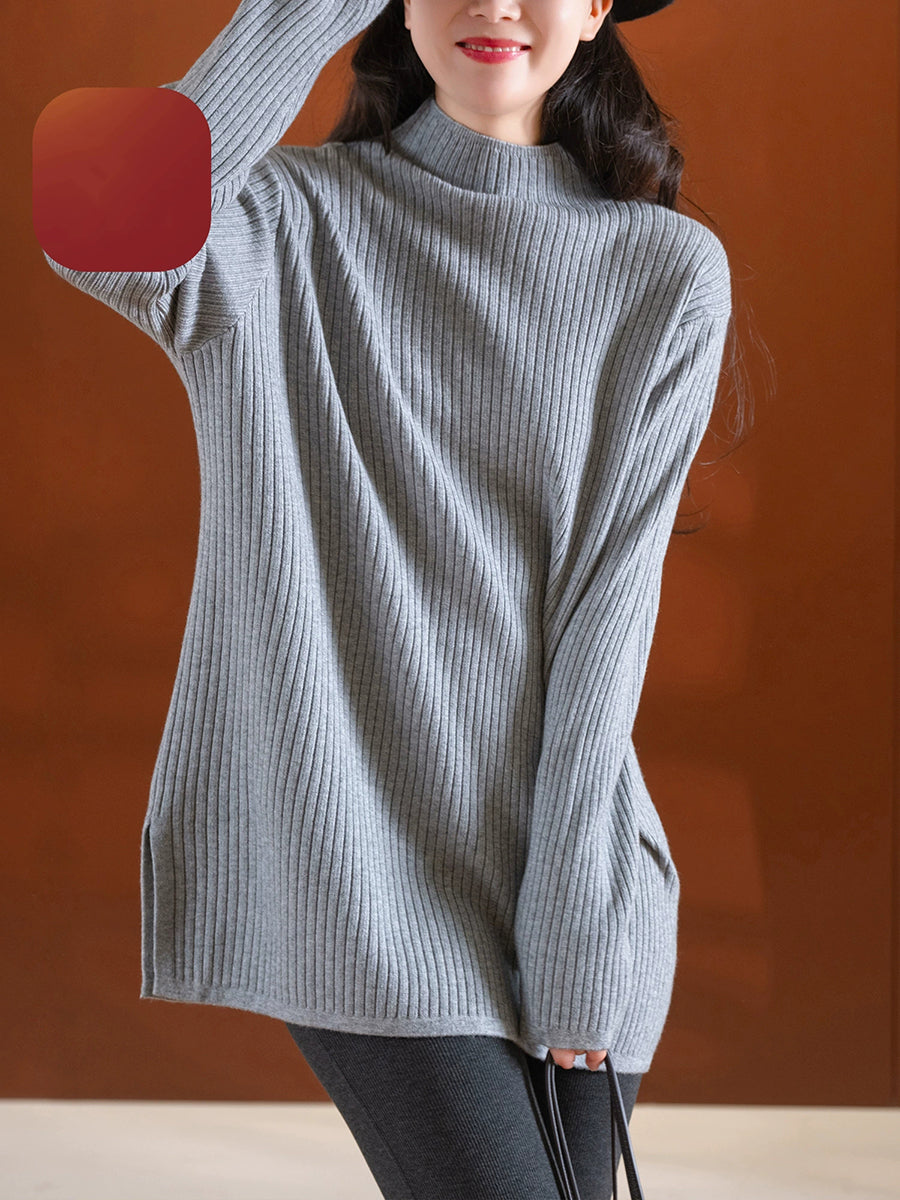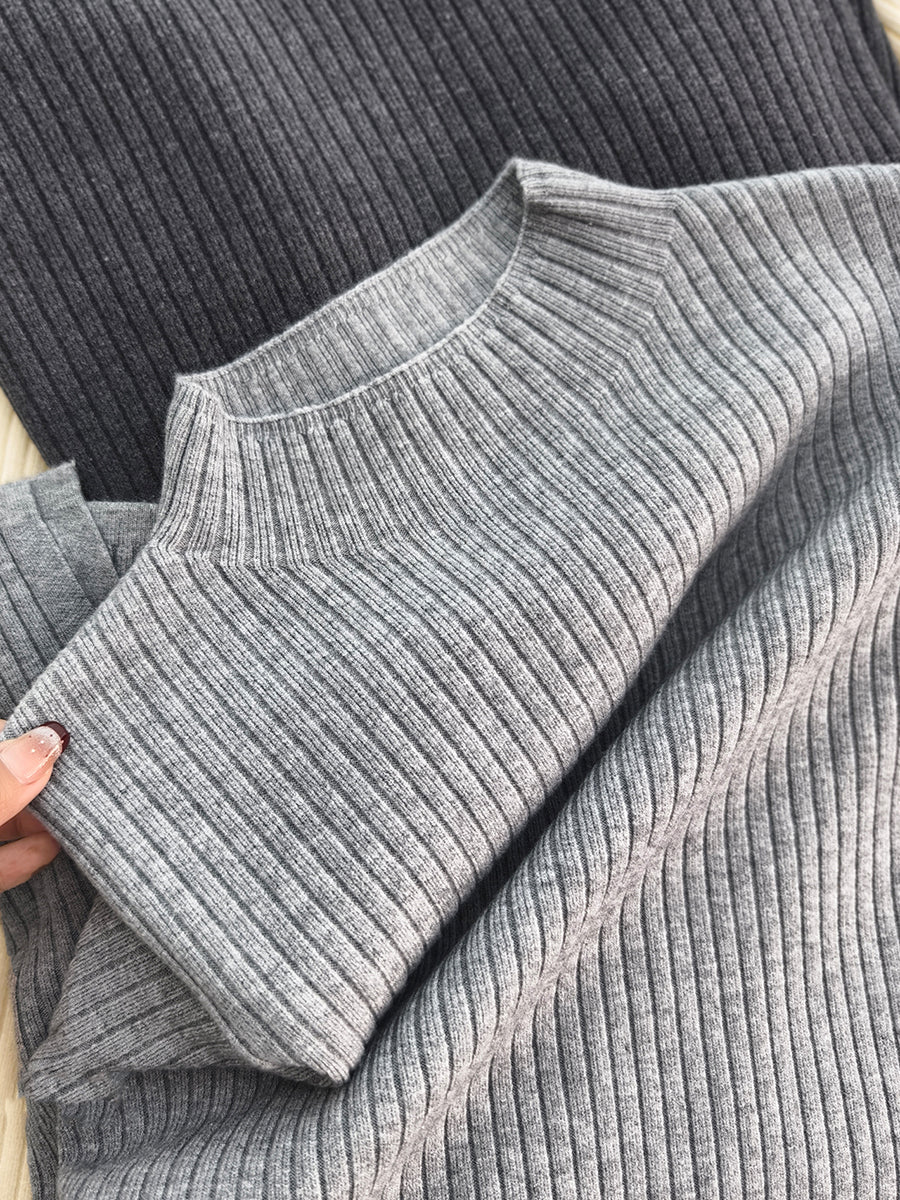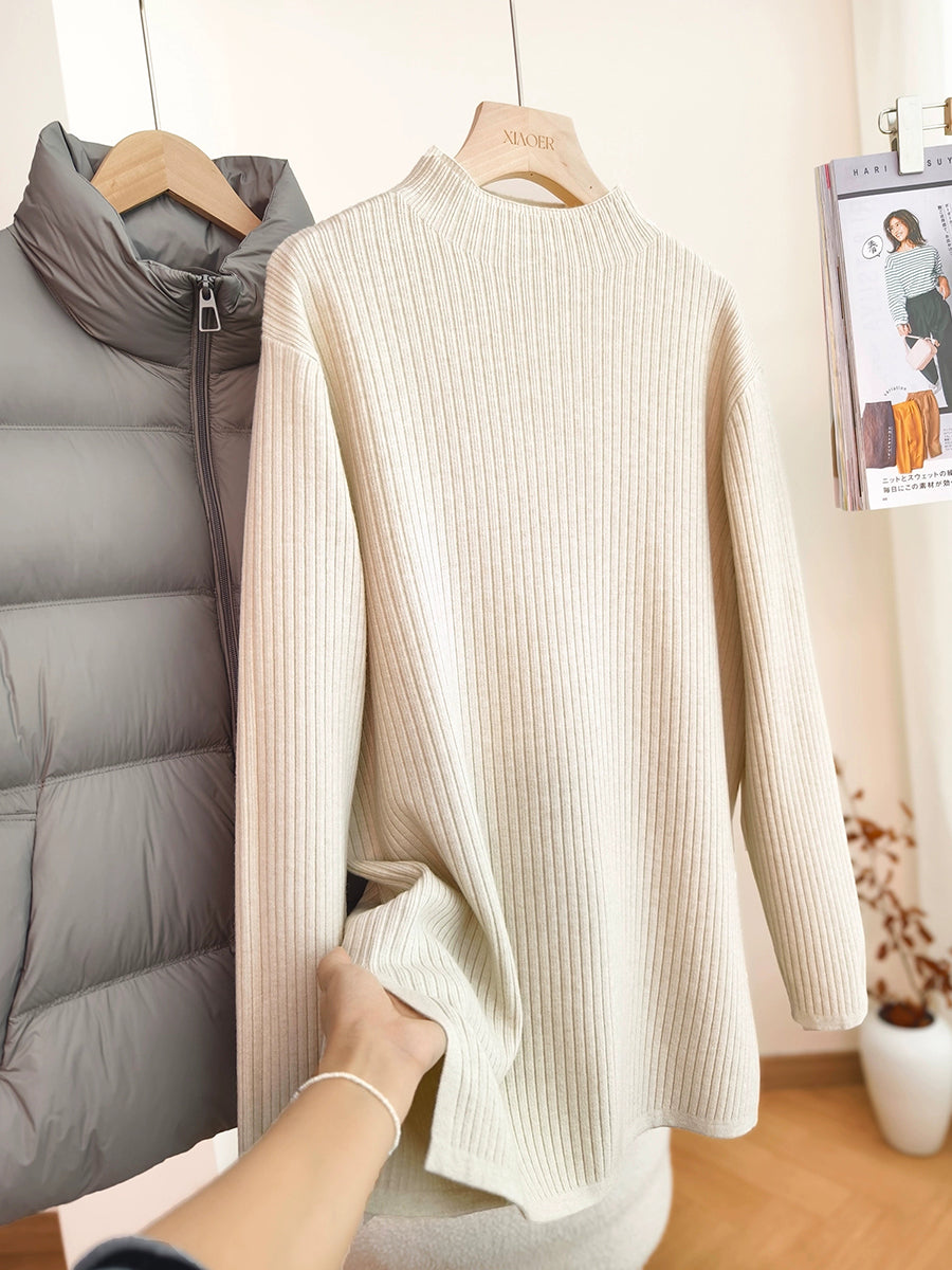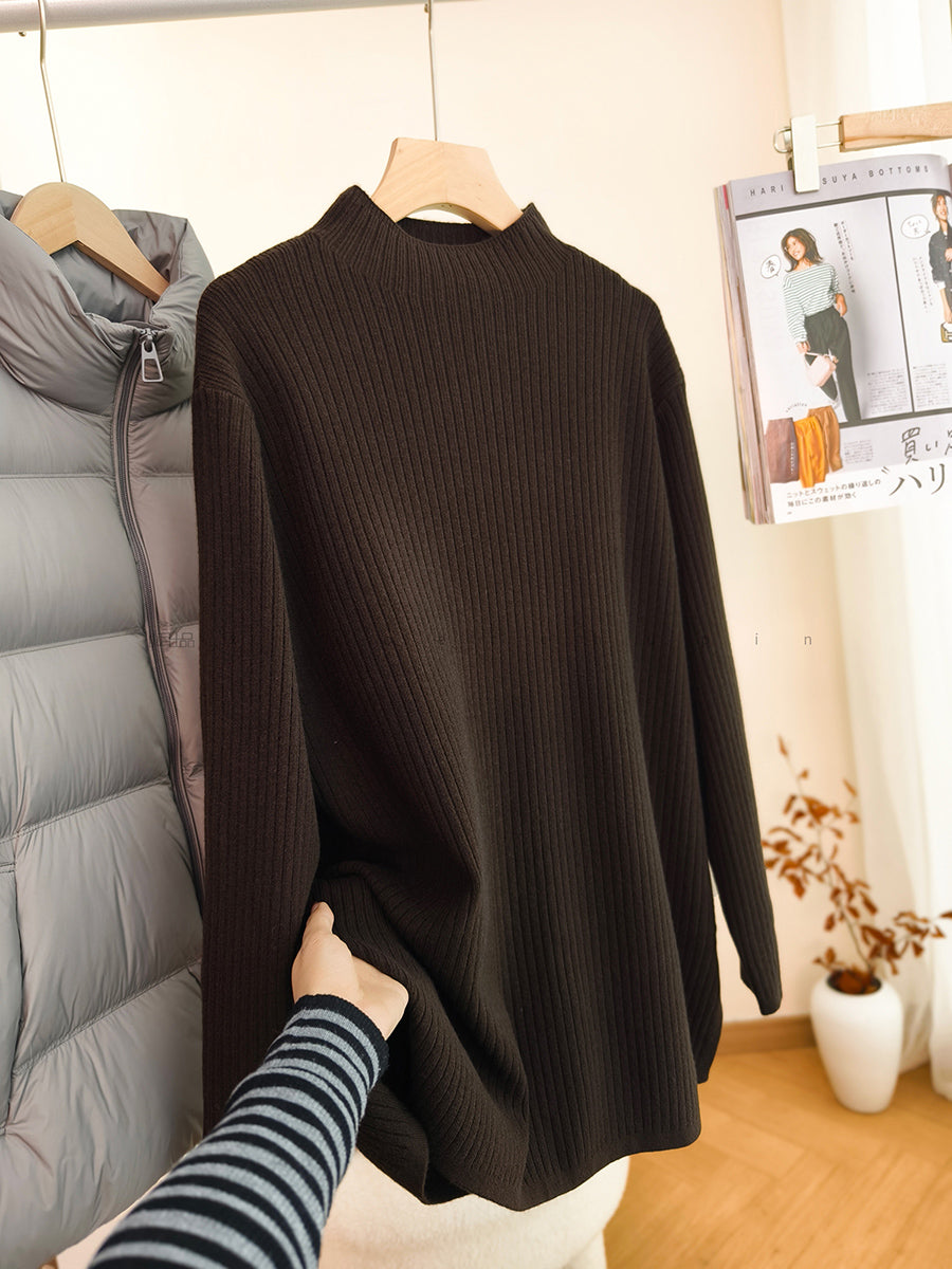 Suéter feminino de gola alta curta em cores lisas, estilo artístico outonal.