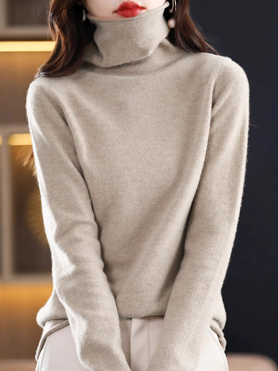 Suéter feminino casual de outono em lã tricotada com gola alta
