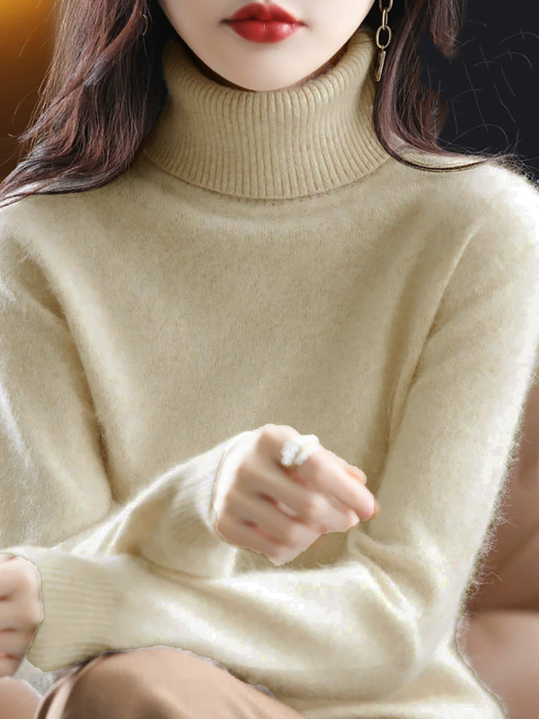 Suéter feminino casual de outono em lã tricotada com gola alta