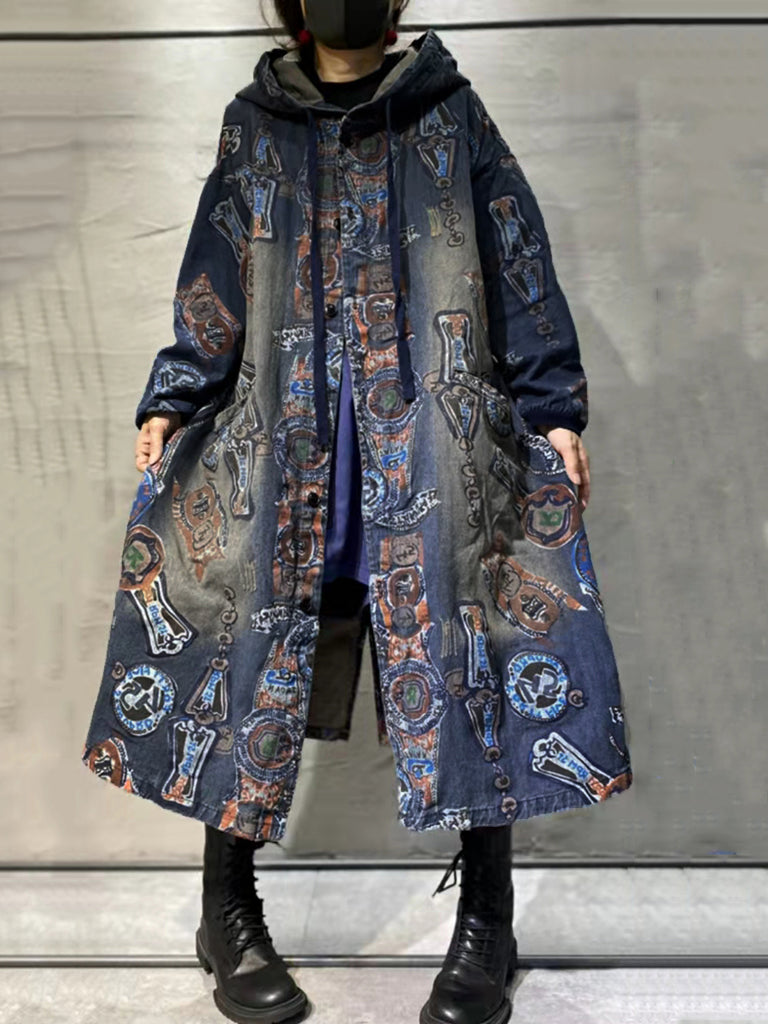 Casaco longo com capuz feminino vintage com flores sólidas e outono