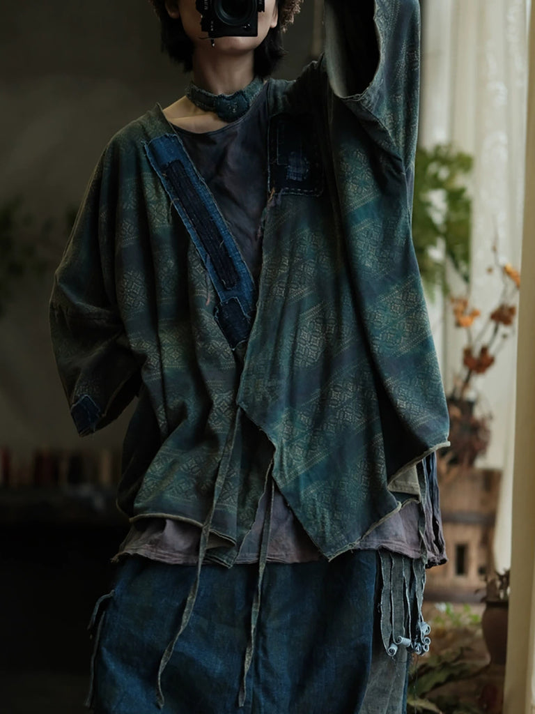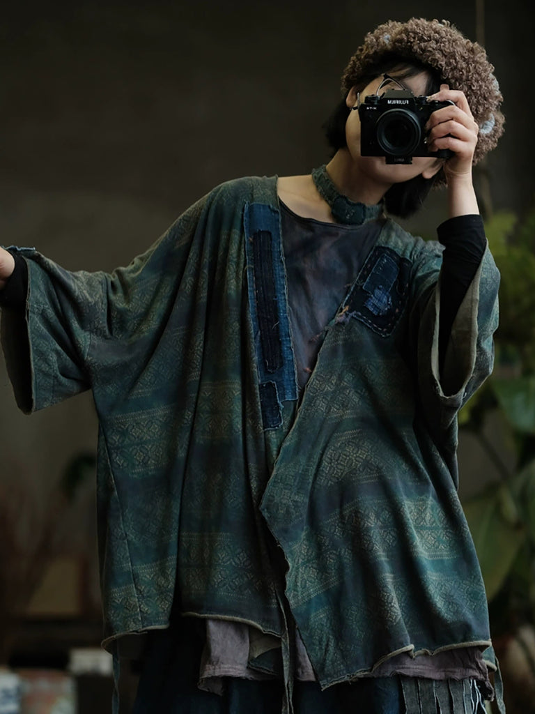 Camisa feminina de algodão com patchwork retrô de outono e gola redonda