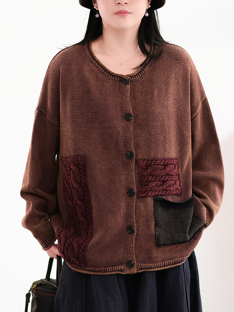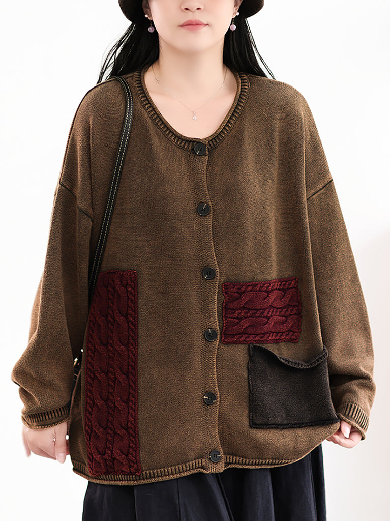Suéter feminino de tricô com gola redonda e detalhes retrô em patchwork, estilo outono.