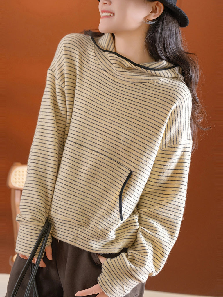 Moletom feminino casual listrado com bolso e capuz macio para o outono.