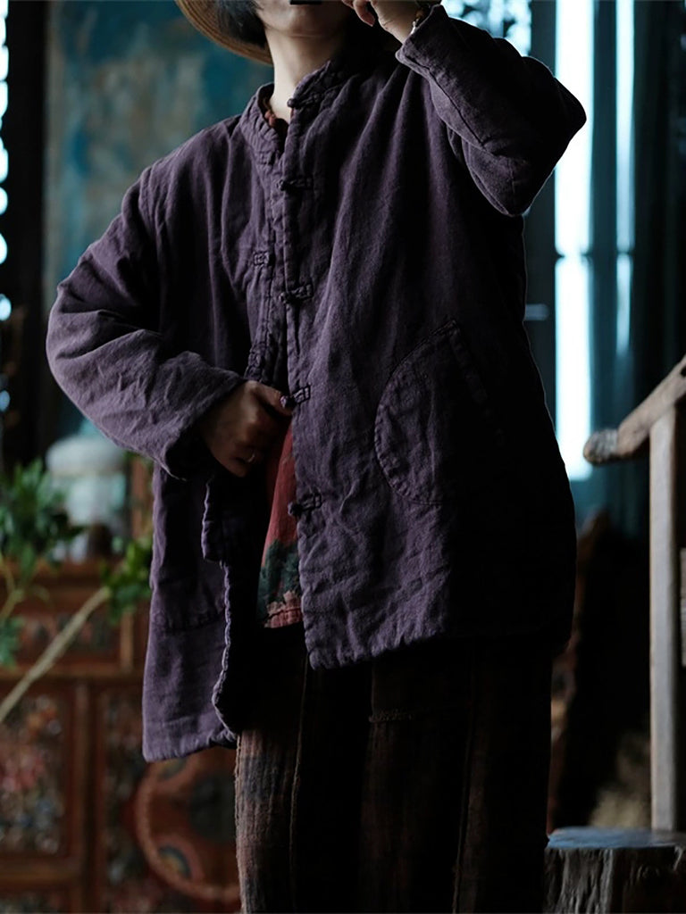 Casaco feminino vintage de outono em algodão e linho de cor pura