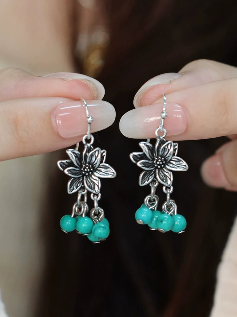 Brincos de borla com contas de turquesa e lótus de liga étnica feminina