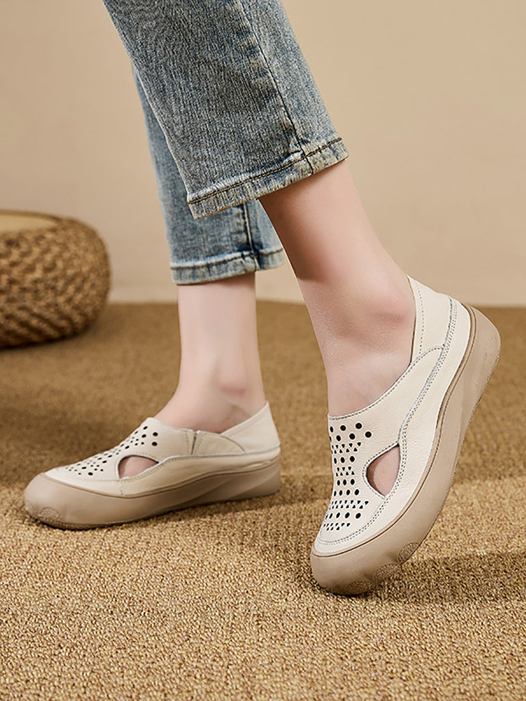 Sapatos femininos casuais de verão em couro com detalhes vazados