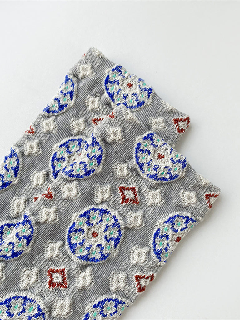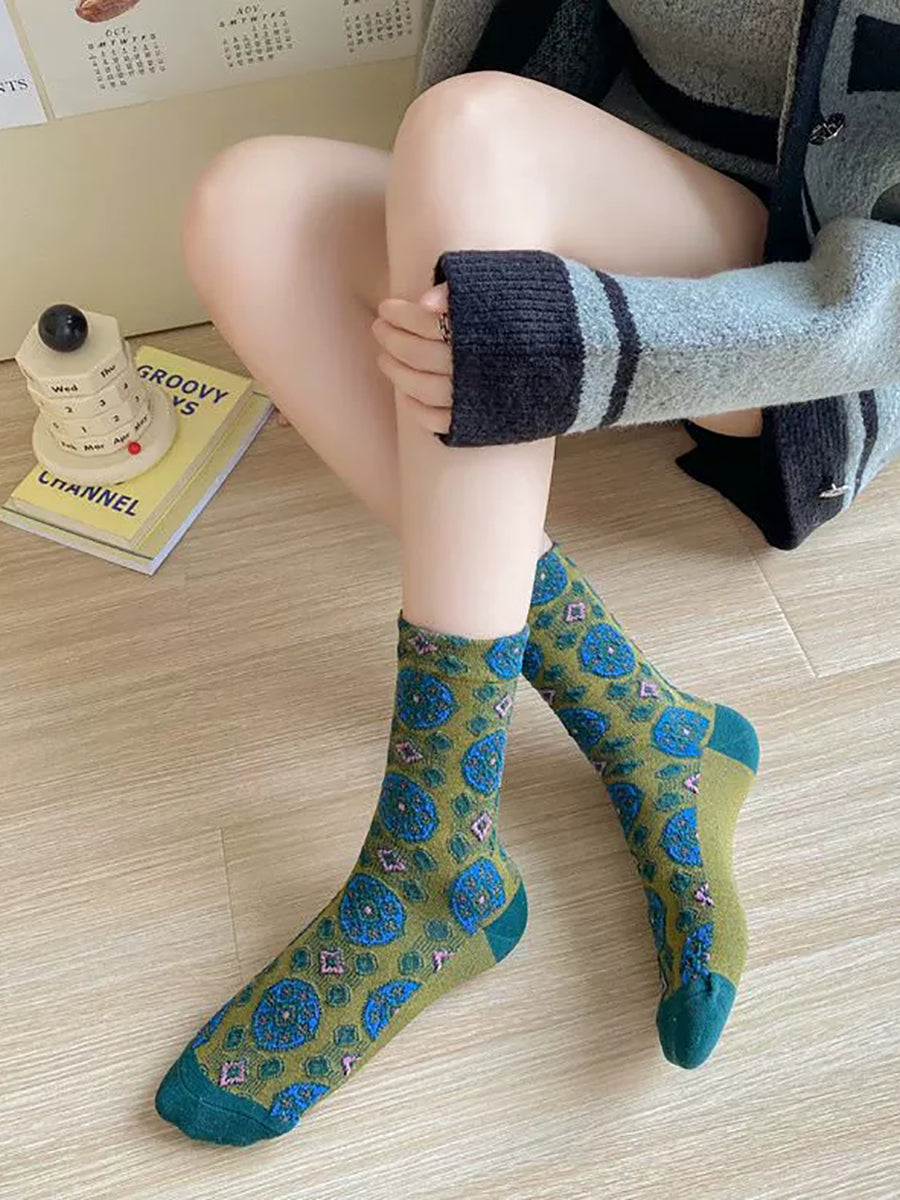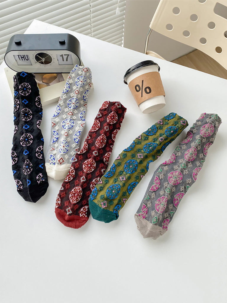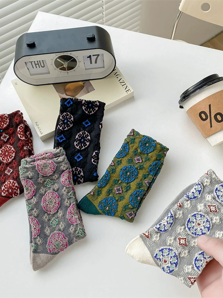5 pares de meias femininas vintage de algodão jacquard com estampa de círculos.