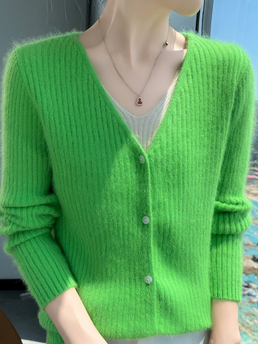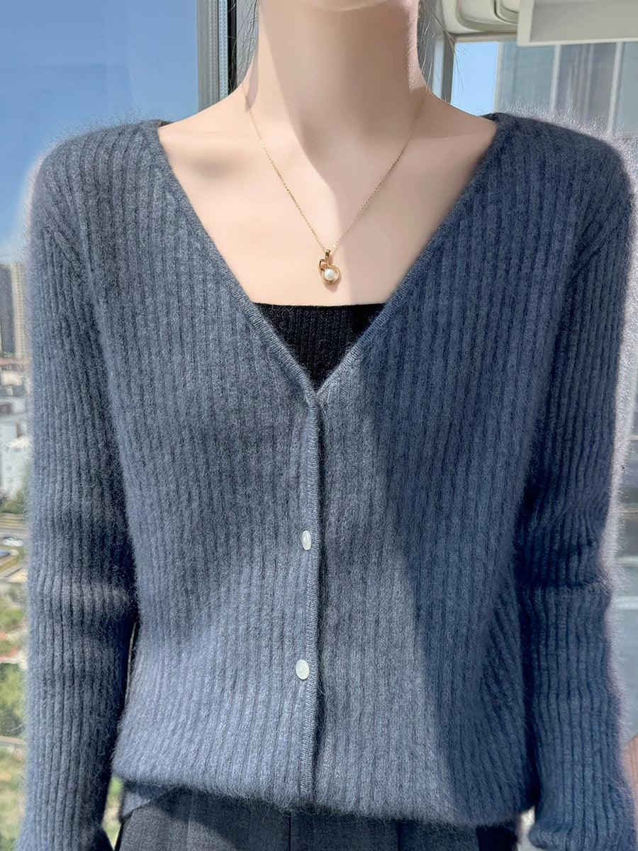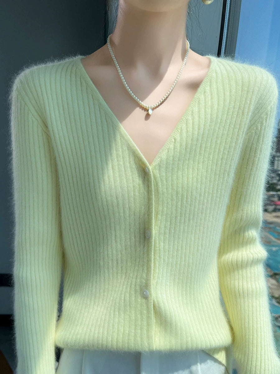 Suéter feminino casual de primavera em cor lisa com decote em V