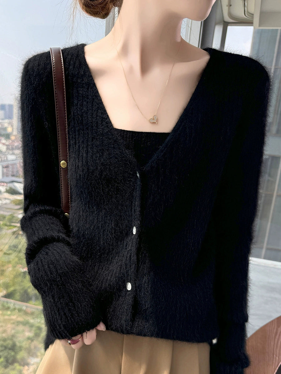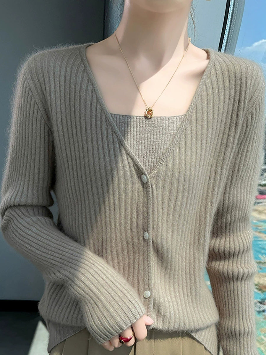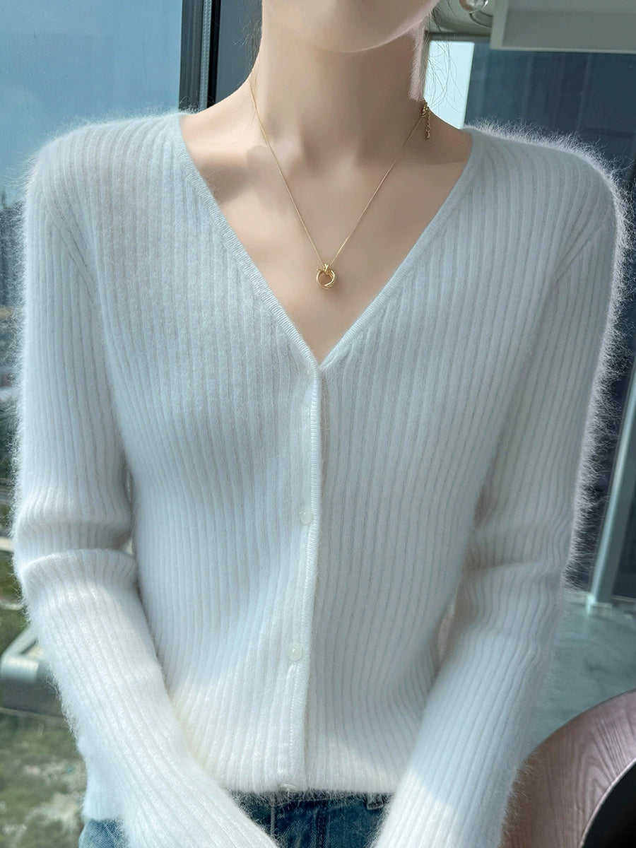 Suéter feminino casual de primavera em cor lisa com decote em V