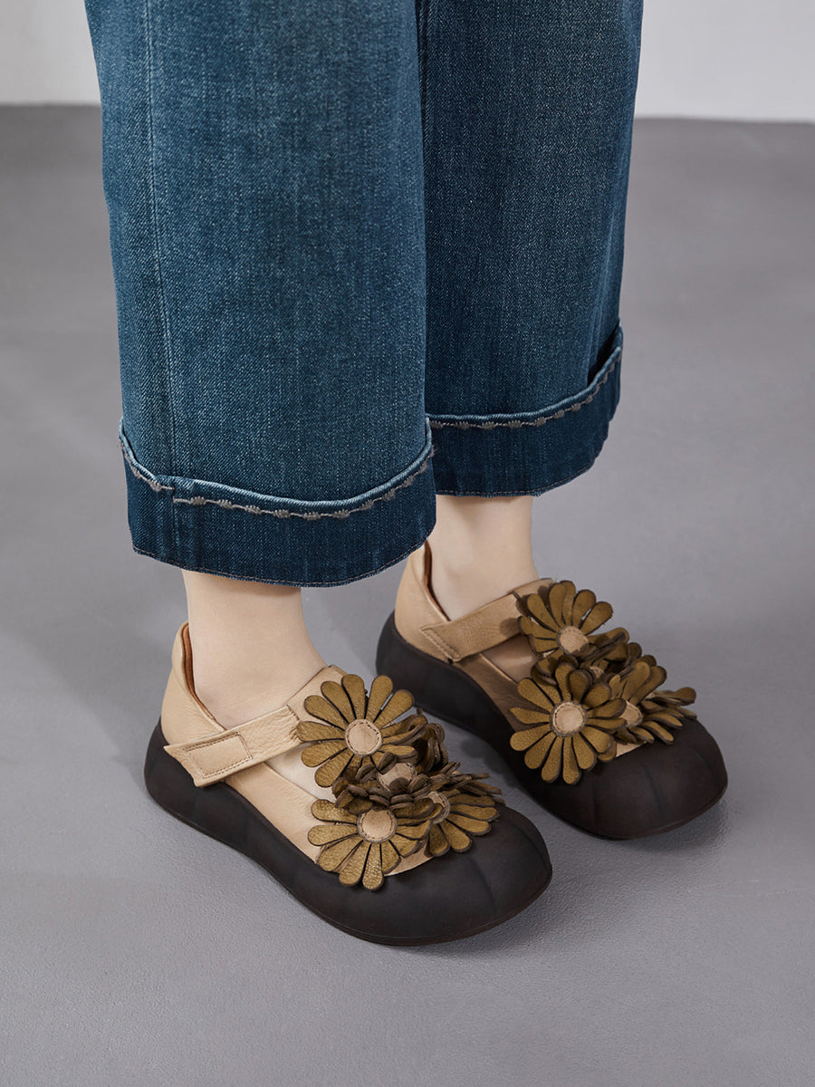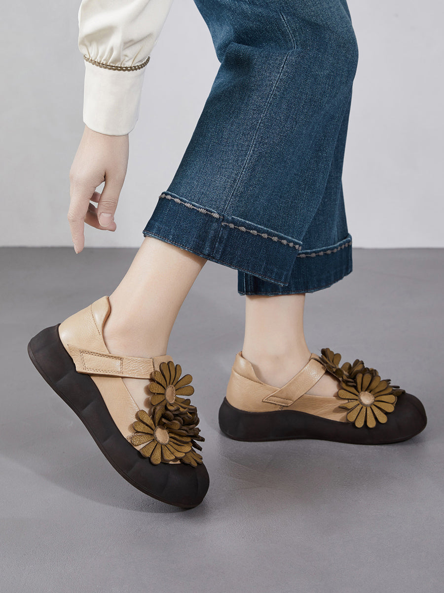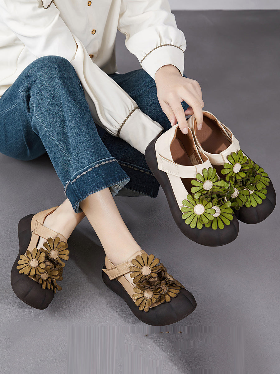 Sapatos femininos de verão retrô em couro legítimo com estampa floral.