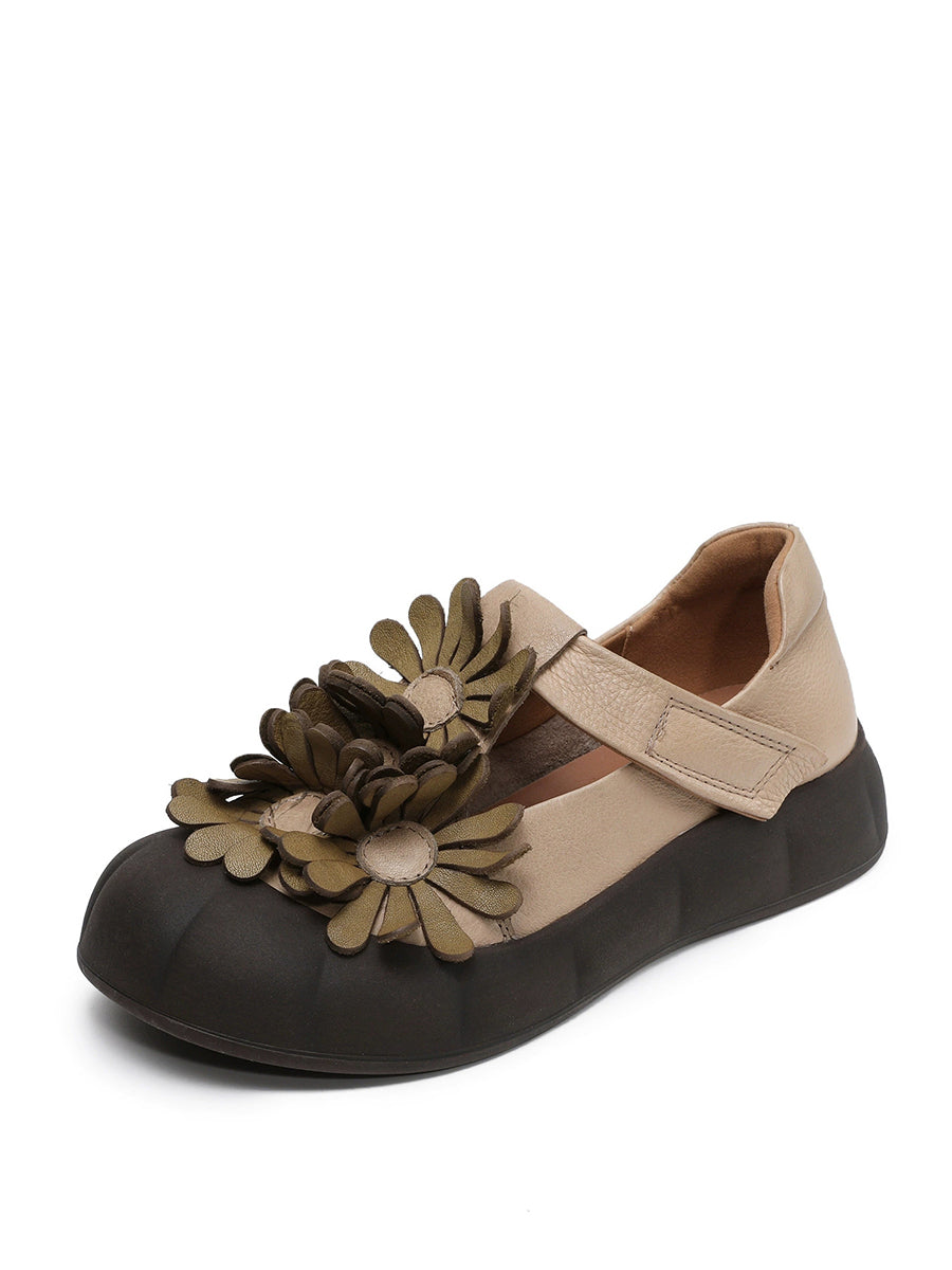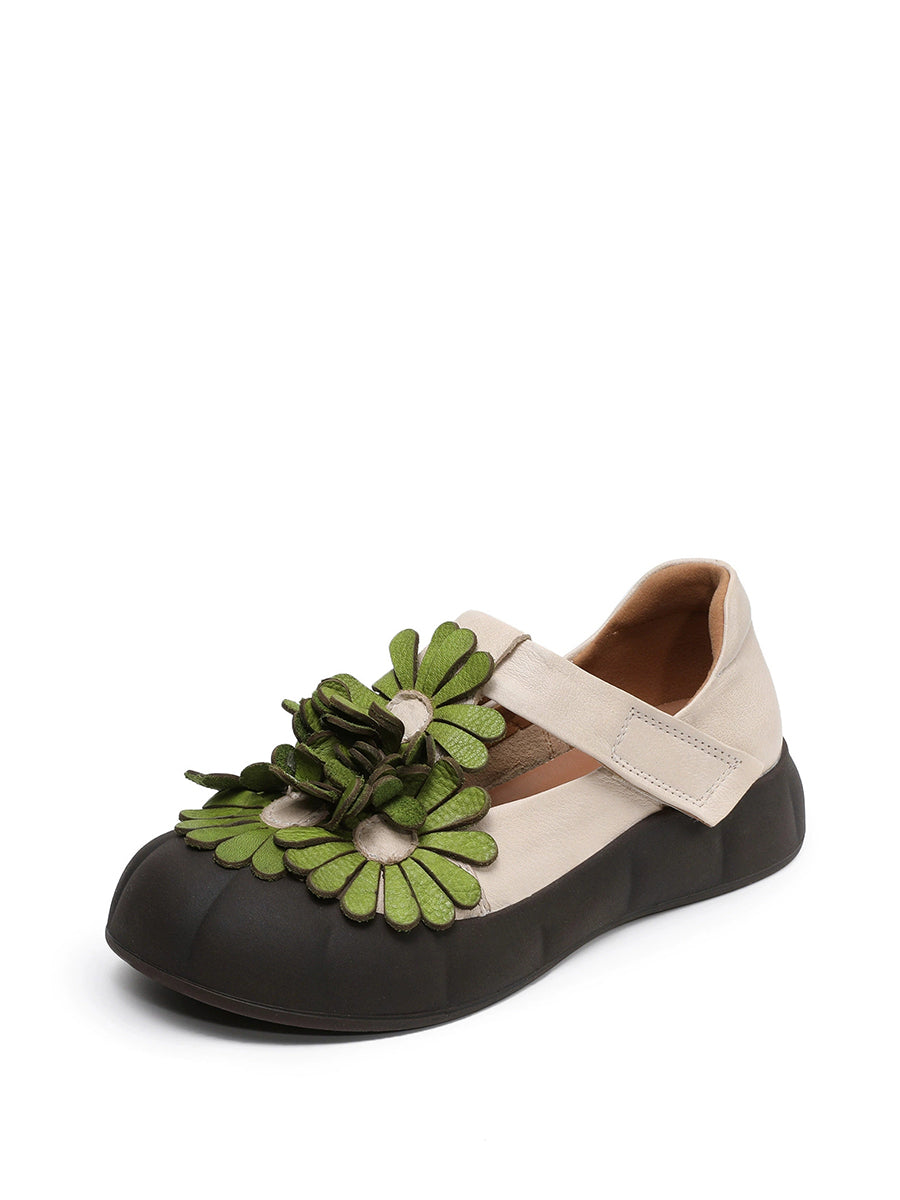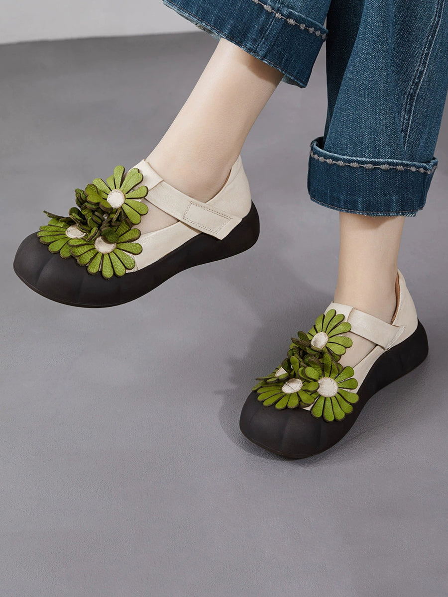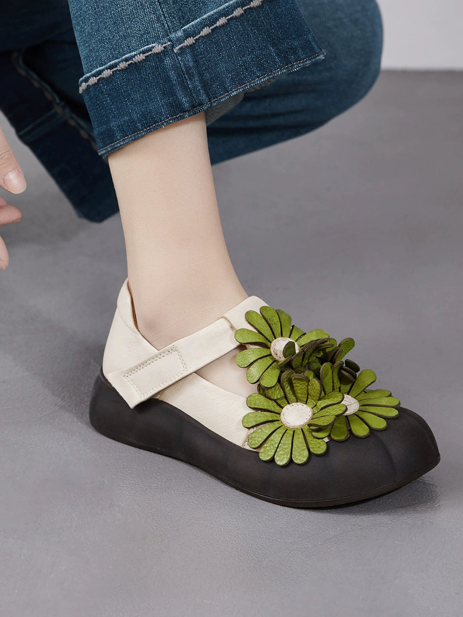 Sapatos femininos de verão retrô em couro legítimo com estampa floral.