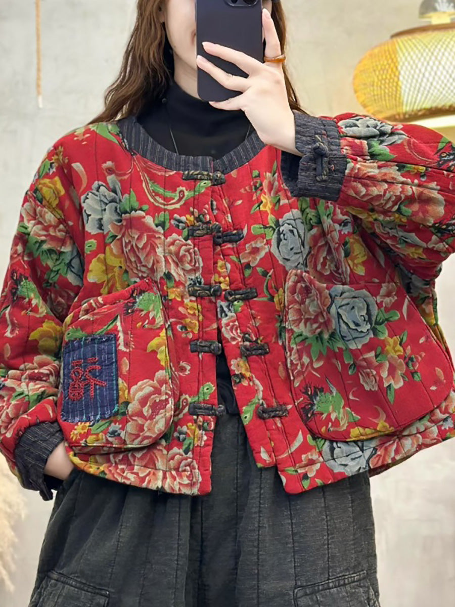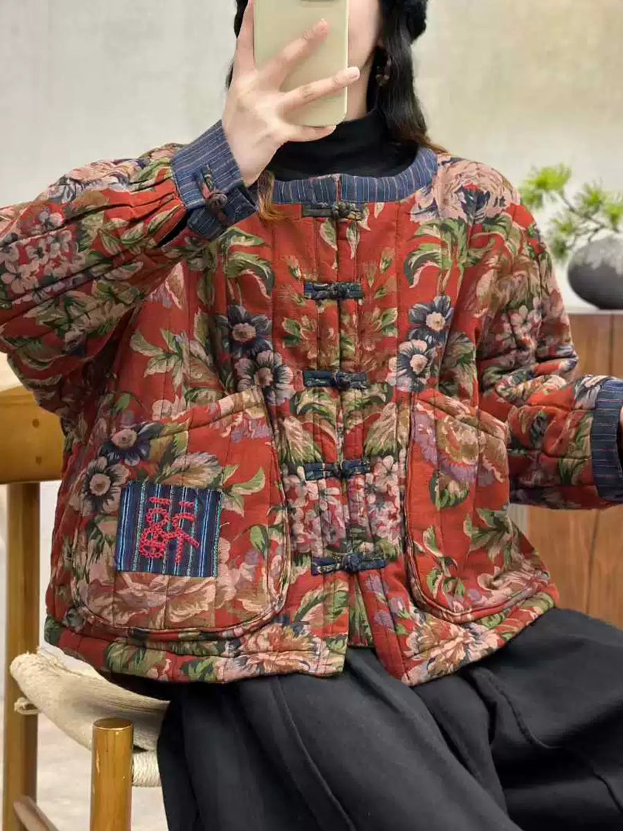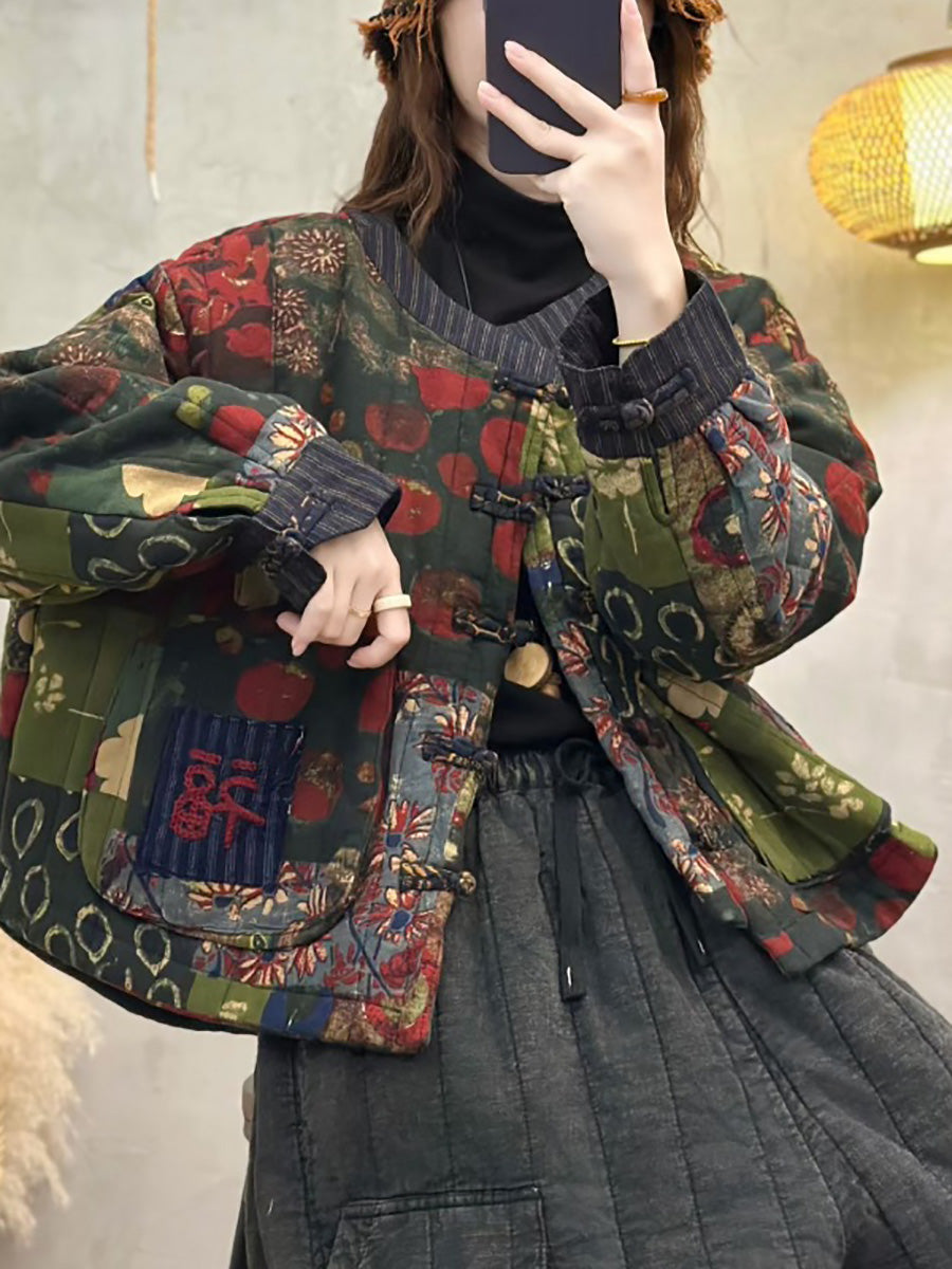 Women Winter Retro Patch Spliced O-Neck Padded Coat