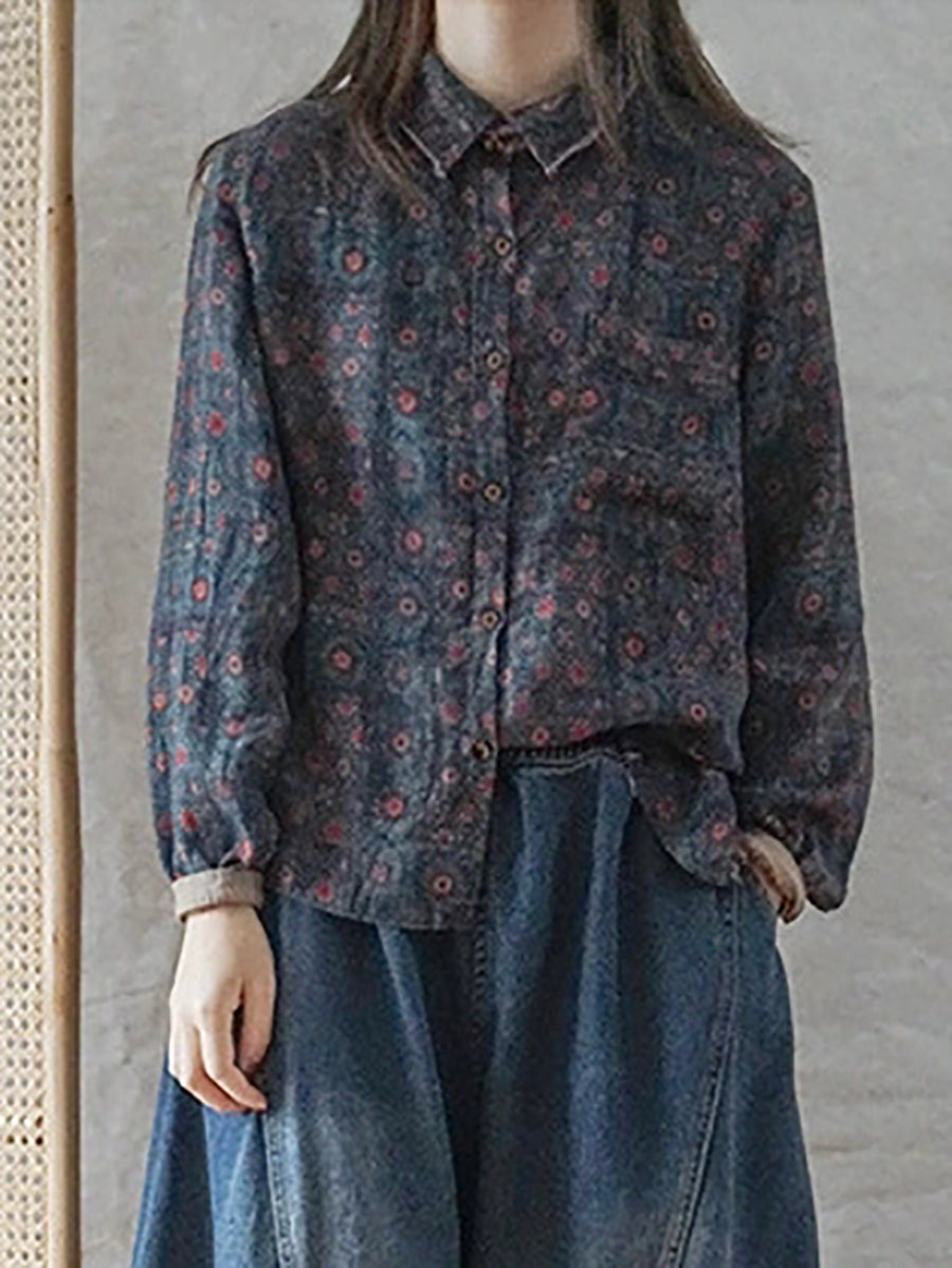 Women Artsy Spring Flower Turn-down Collar Cotton Shirt