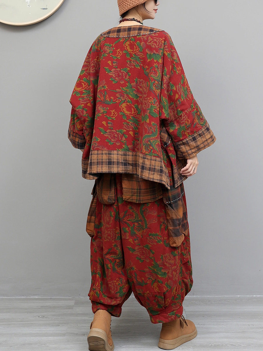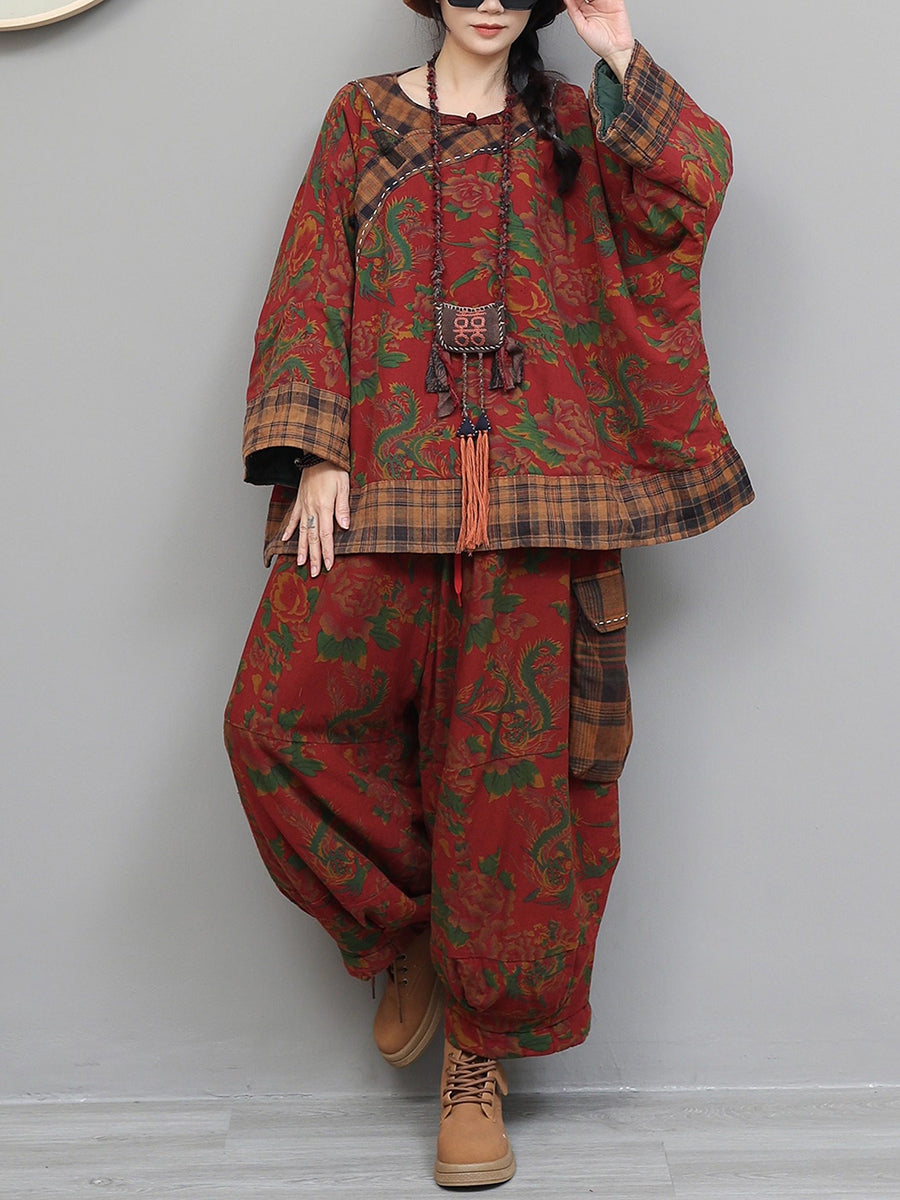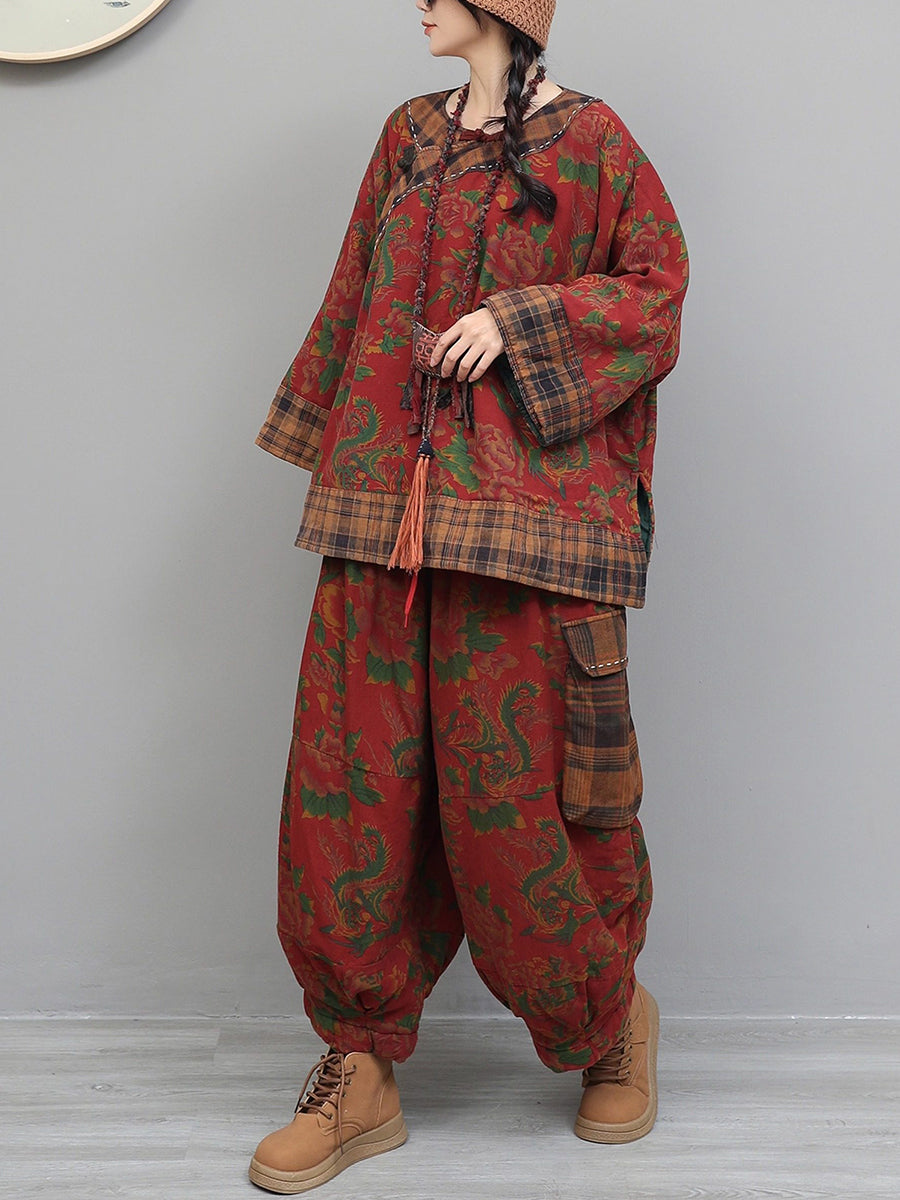 Women Winter Retro Flower Plaid Spliced O-Neck Padded Suits