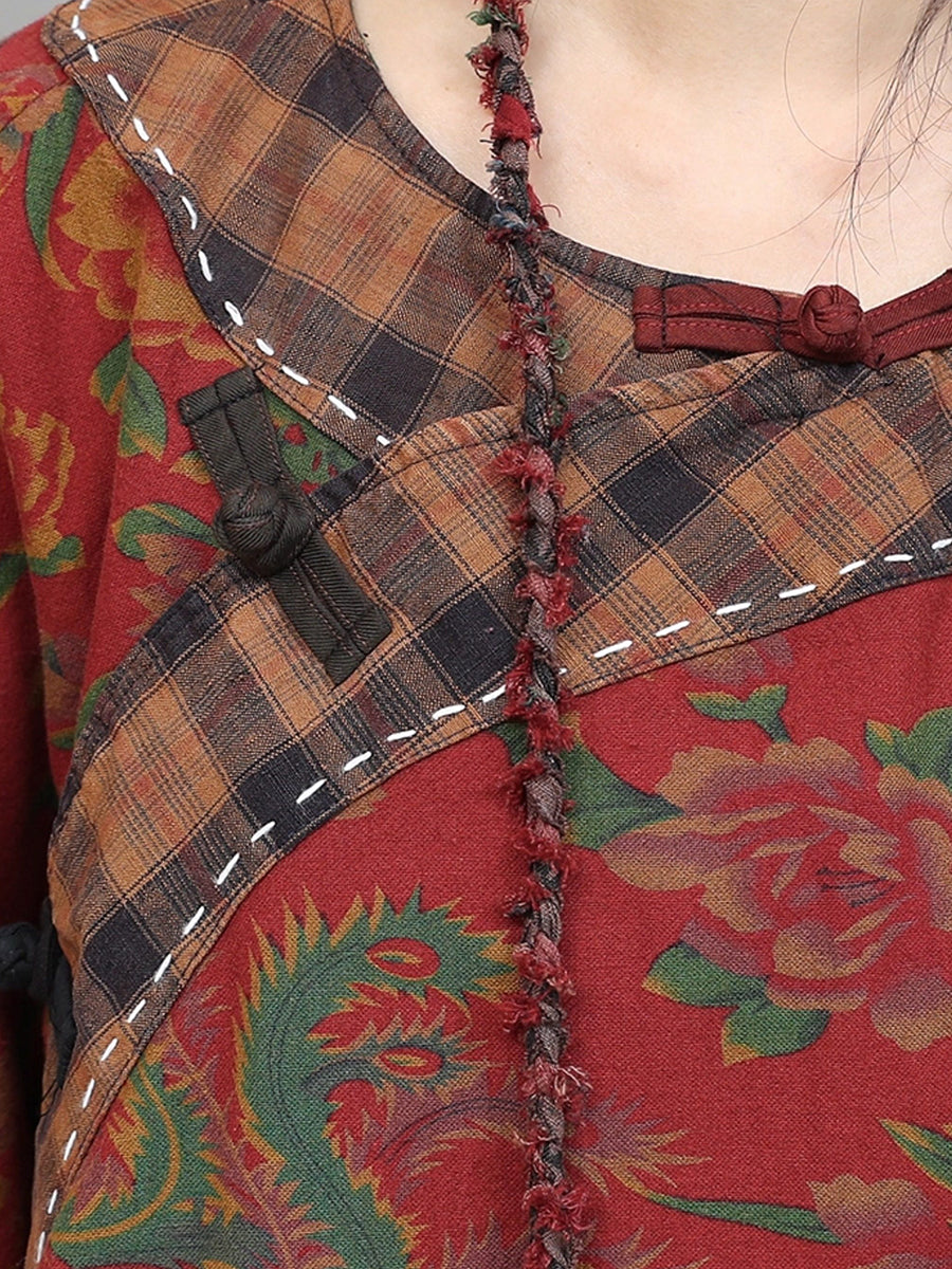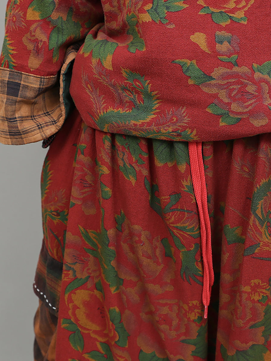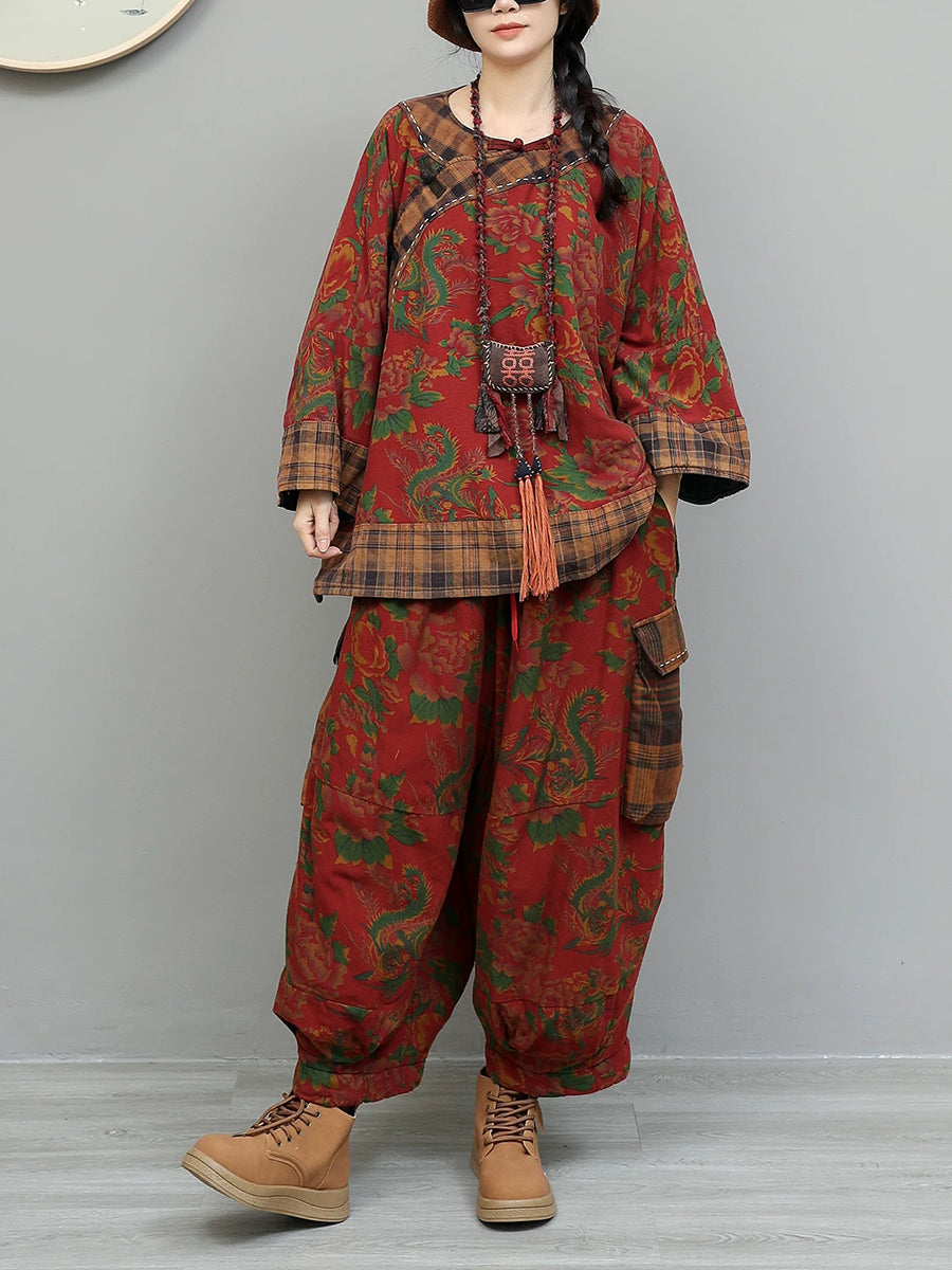 Women Winter Retro Flower Plaid Spliced O-Neck Padded Suits