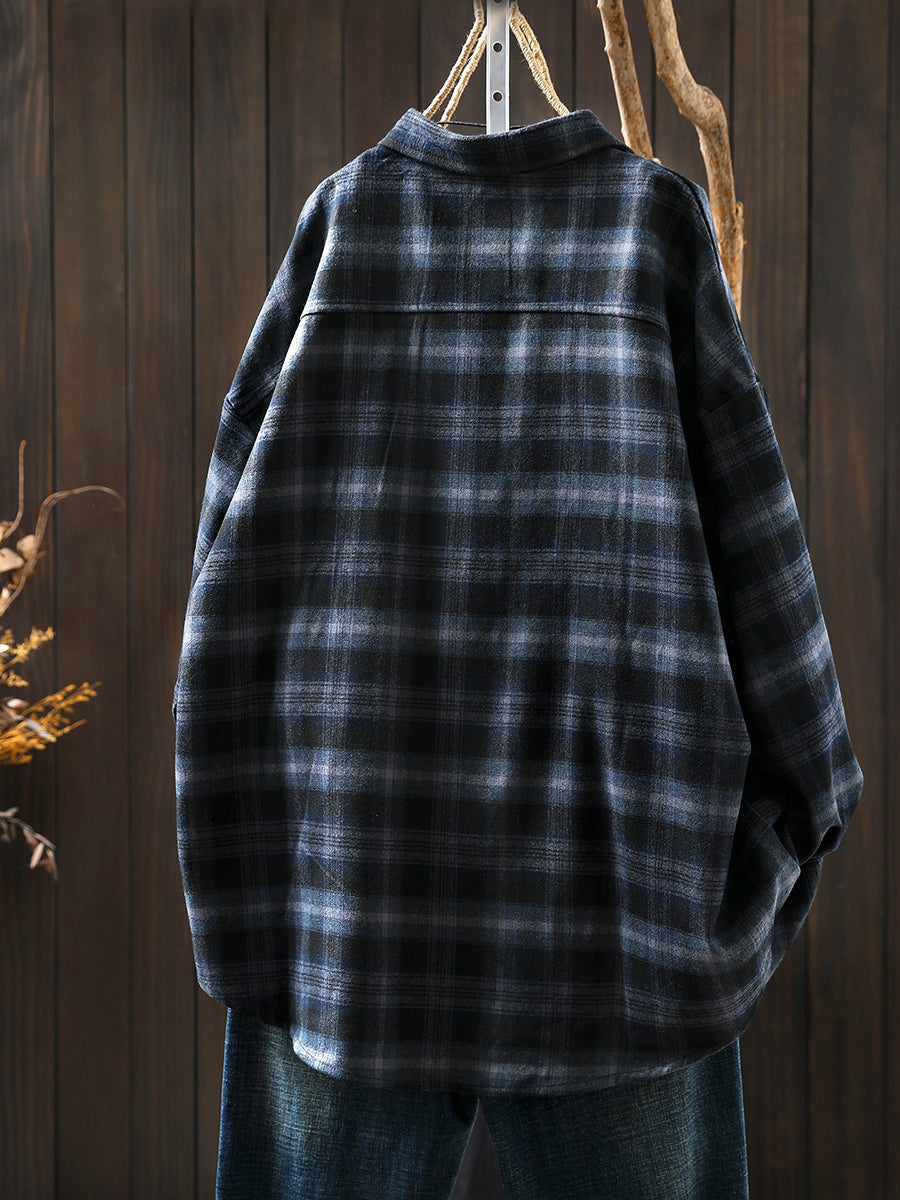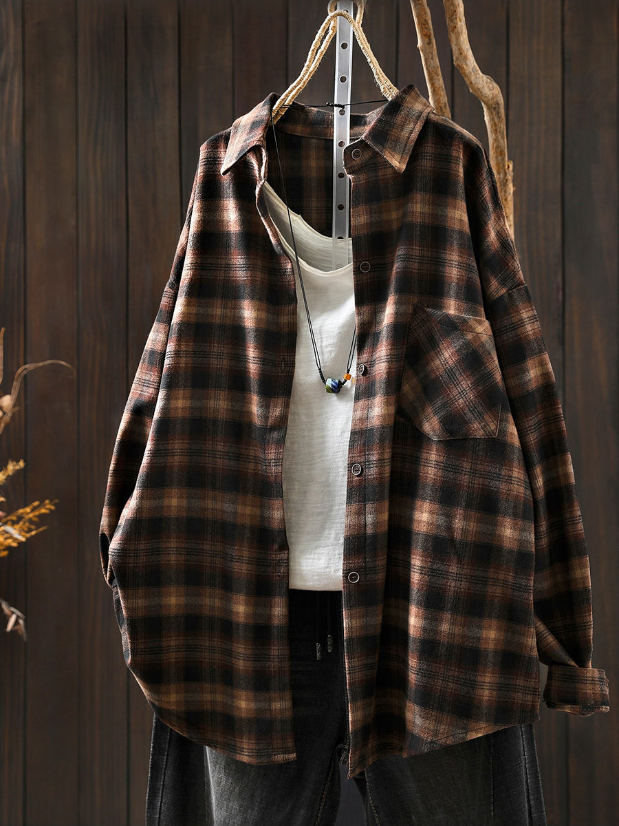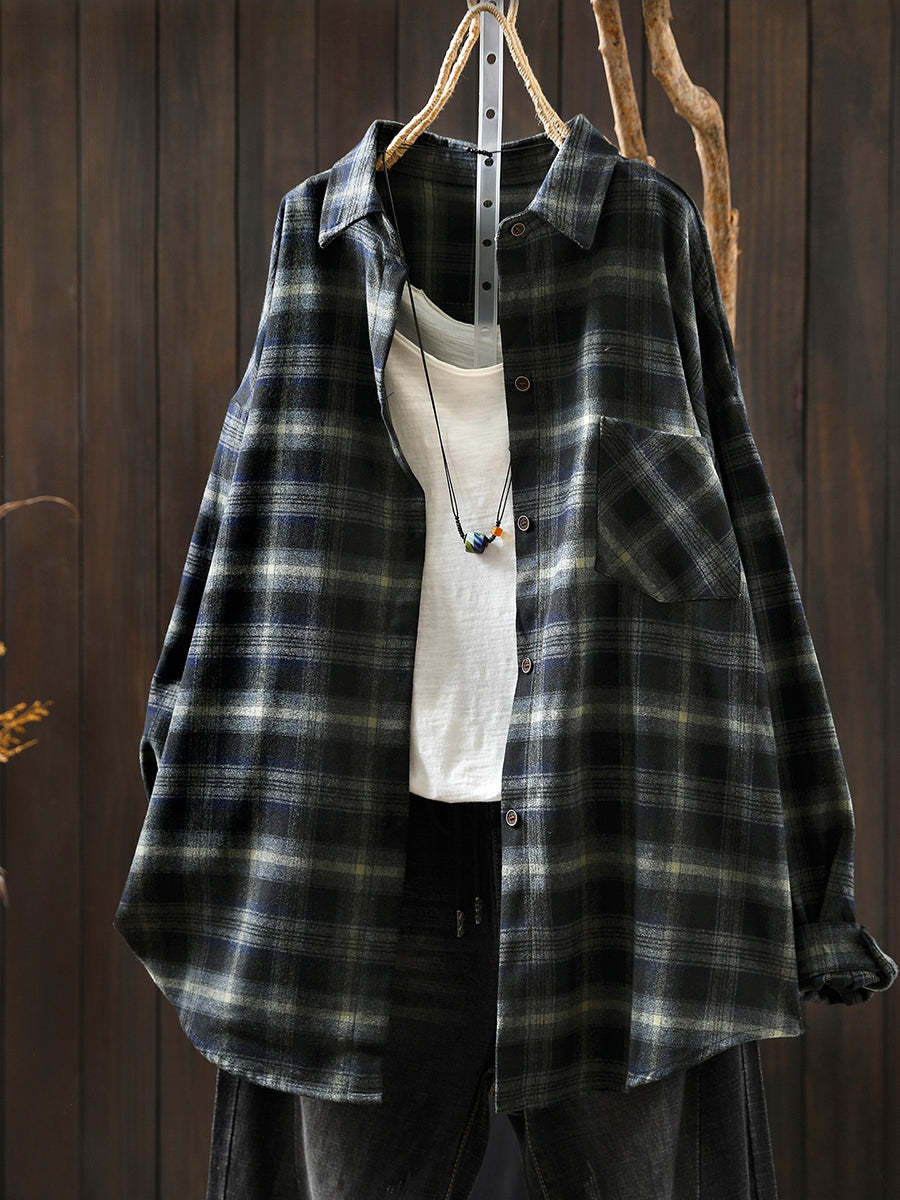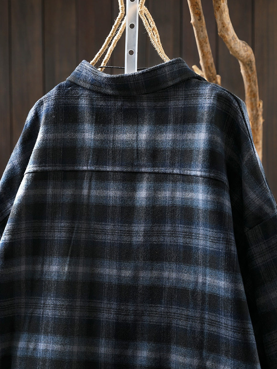 Women Retro Spring Plaid Turn-down Collar Cotton Shirt