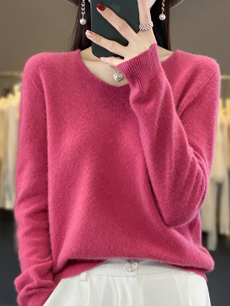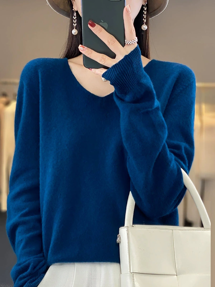 Women Casual Spring Pure Color V-Neck Sweater
