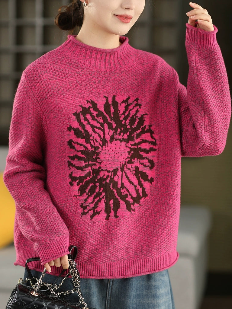 Women Autumn Artsy Flower Half-Turtleneck Sweater