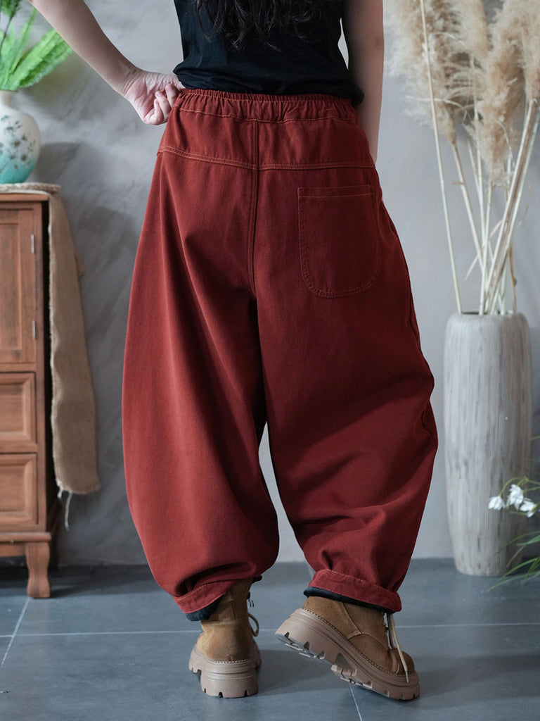 Women Winter Retro Pure Color Fleece-lined Harem Pants