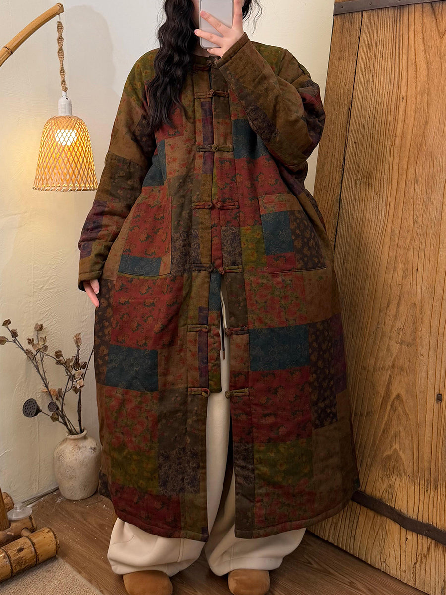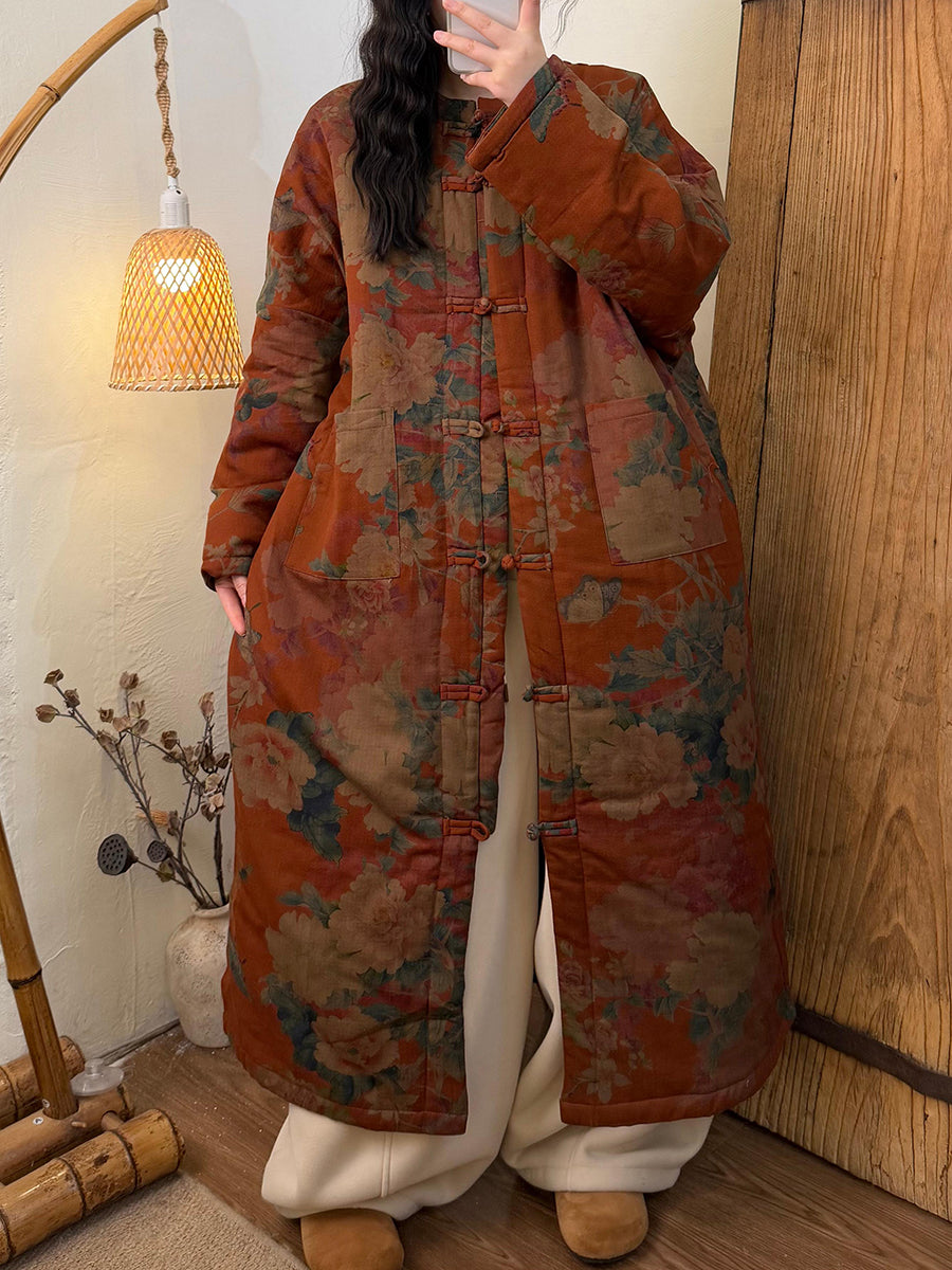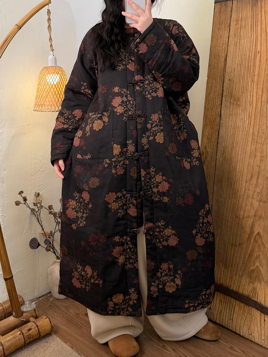 Women Winter Retro Flower Padded O-Neck Long Coat