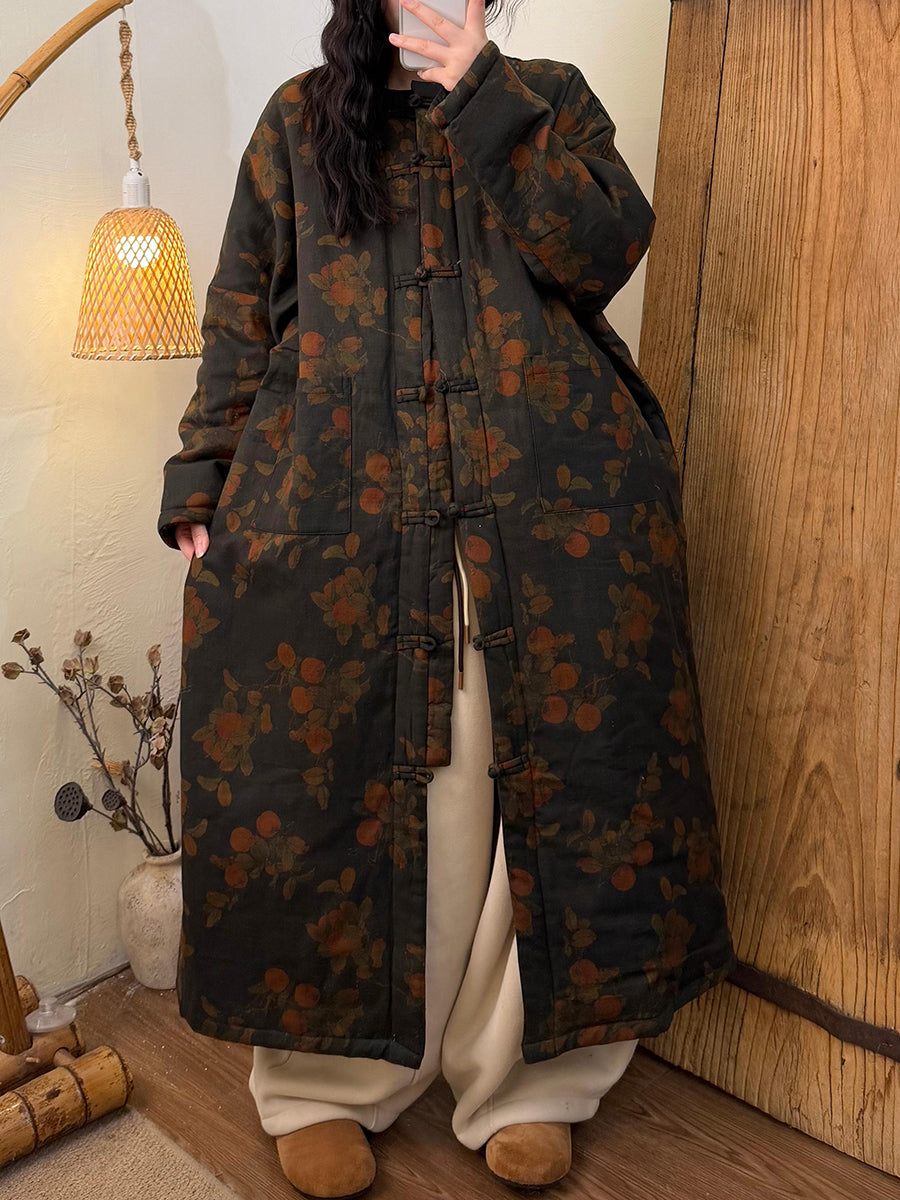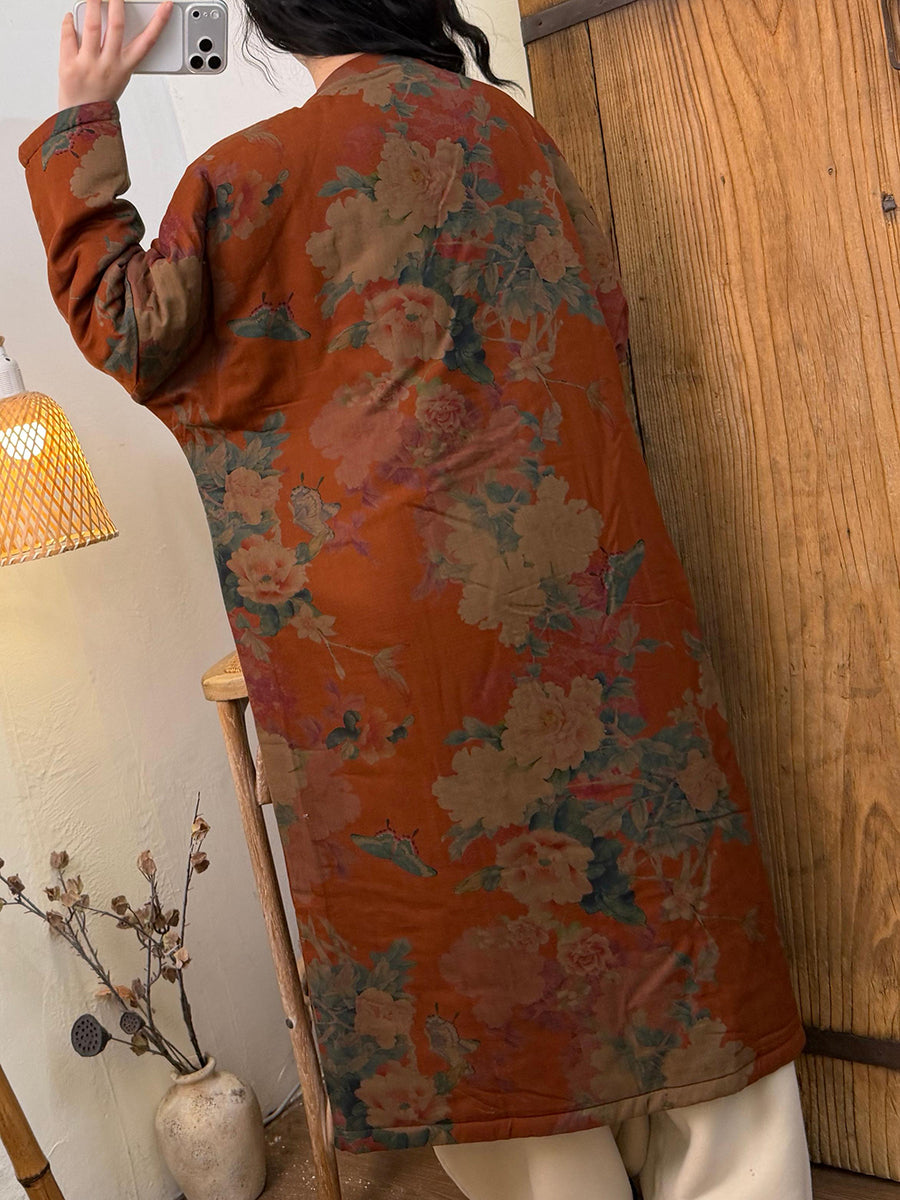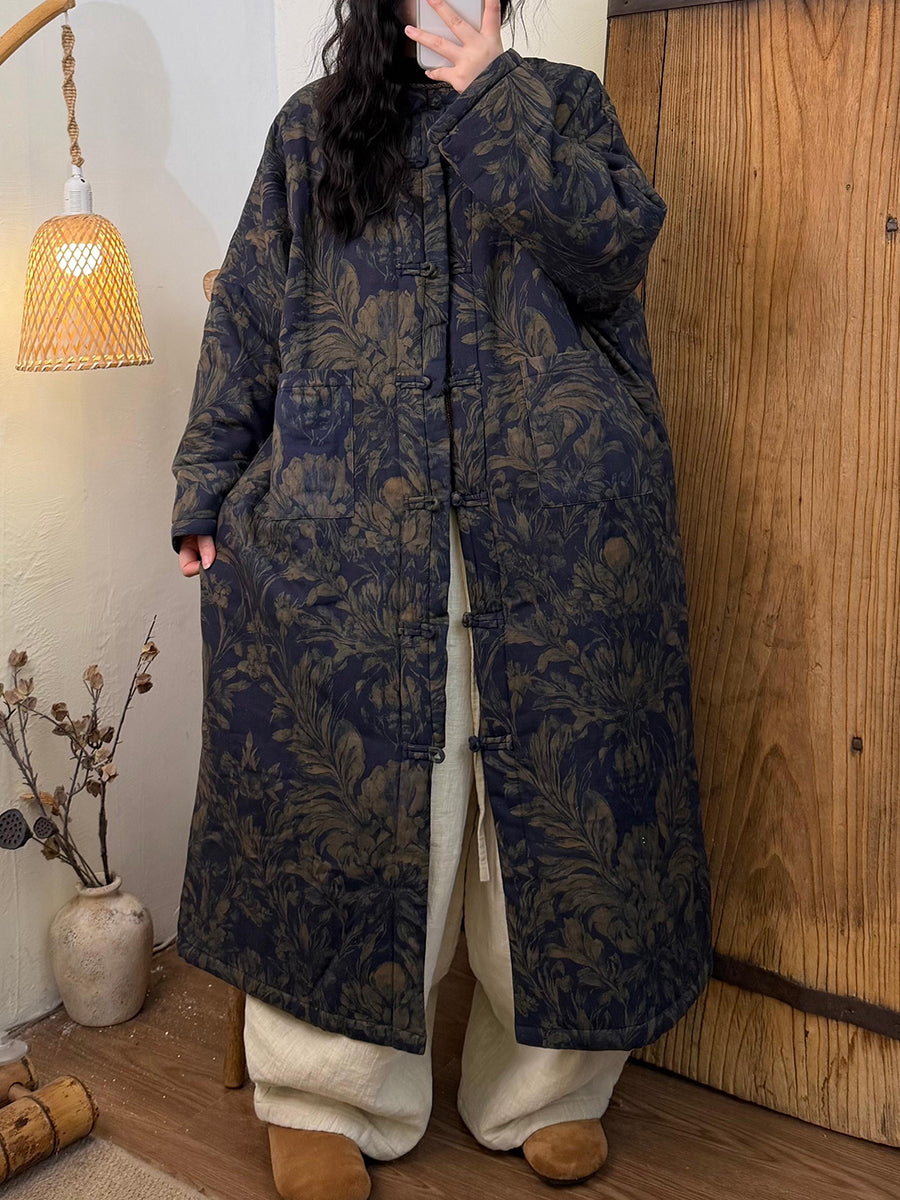 Women Winter Retro Flower Padded O-Neck Long Coat