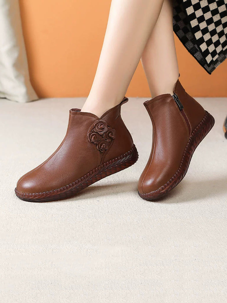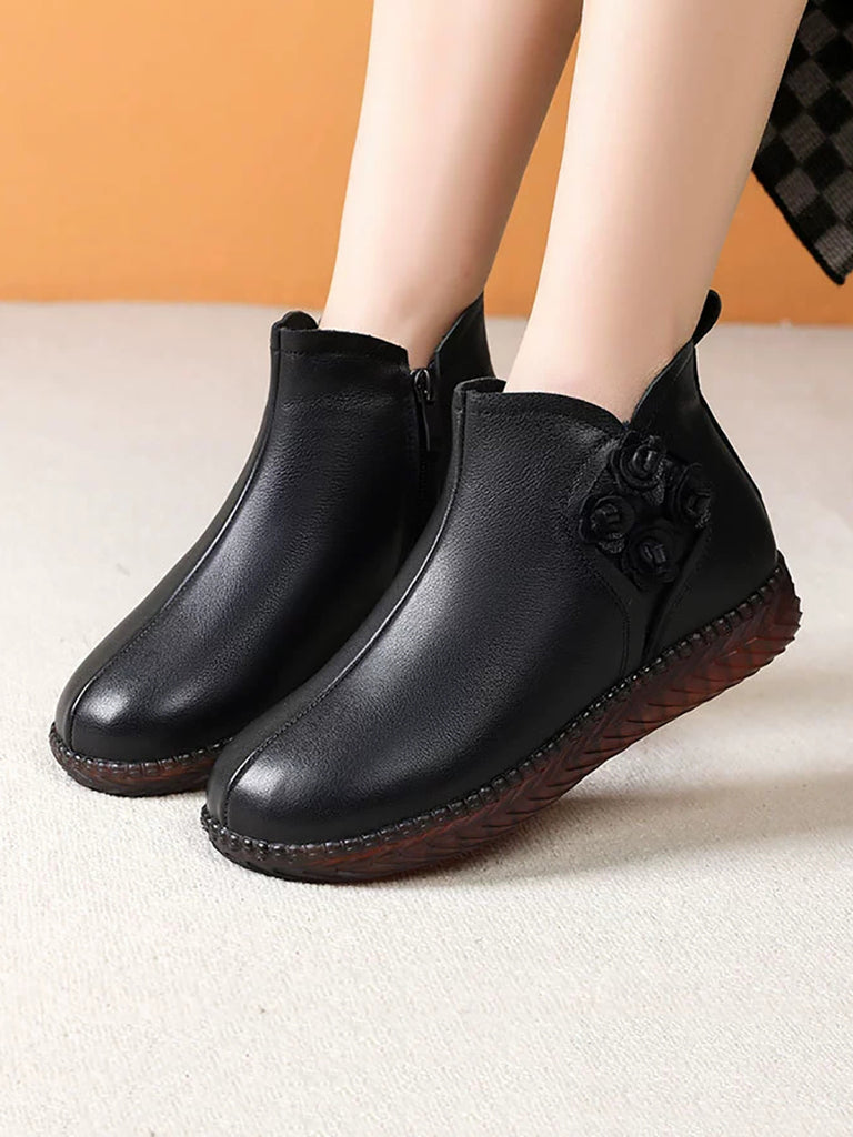 Women Winter Vintage Leather Flower Fleece-lined Boots