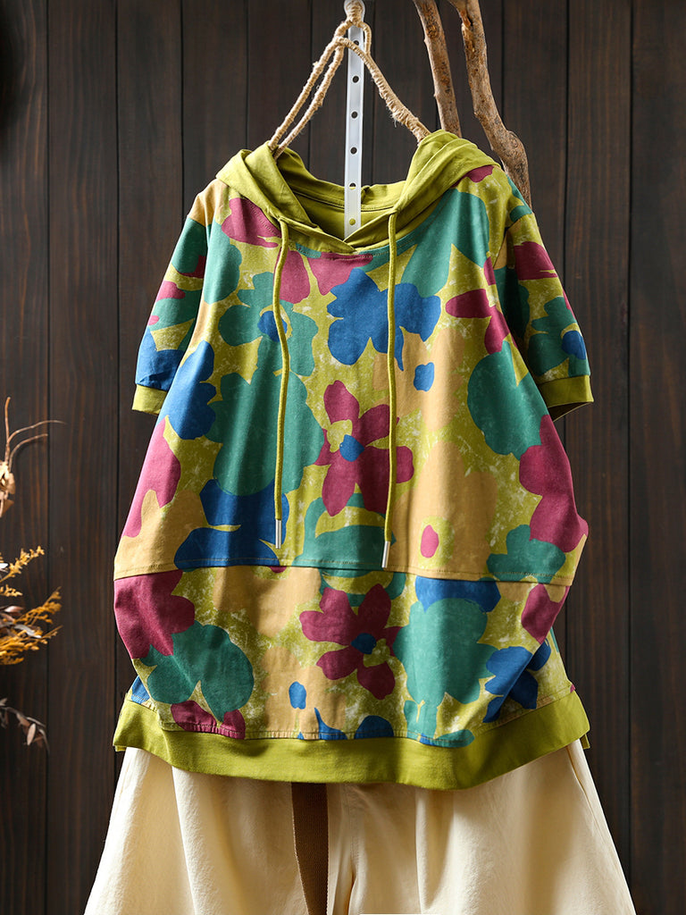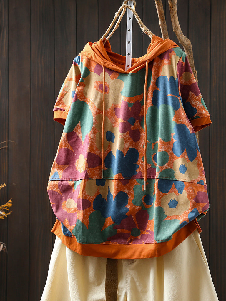 Plus Size Women Summer Casual Print Hooded 100%Cotton Shirt