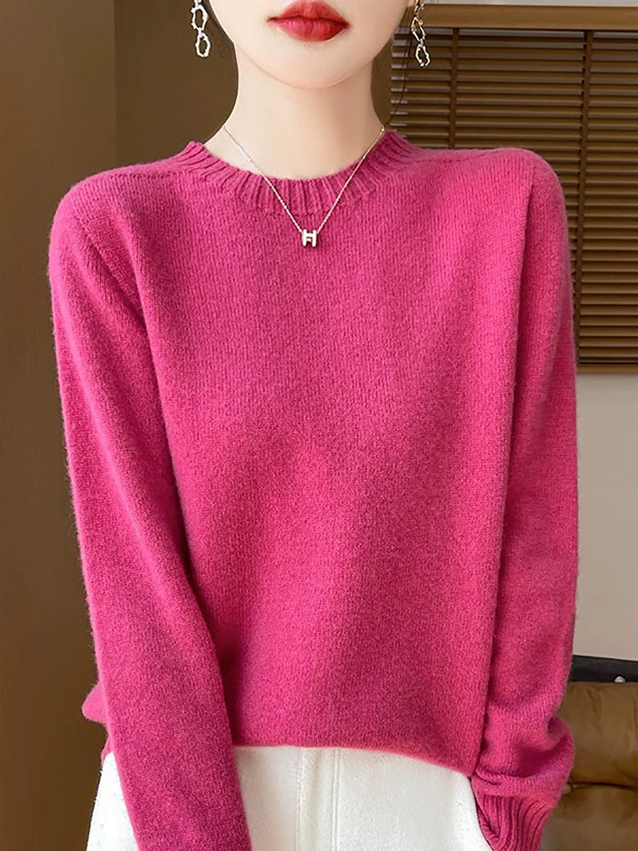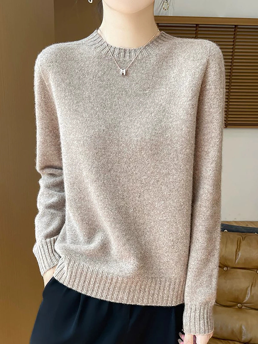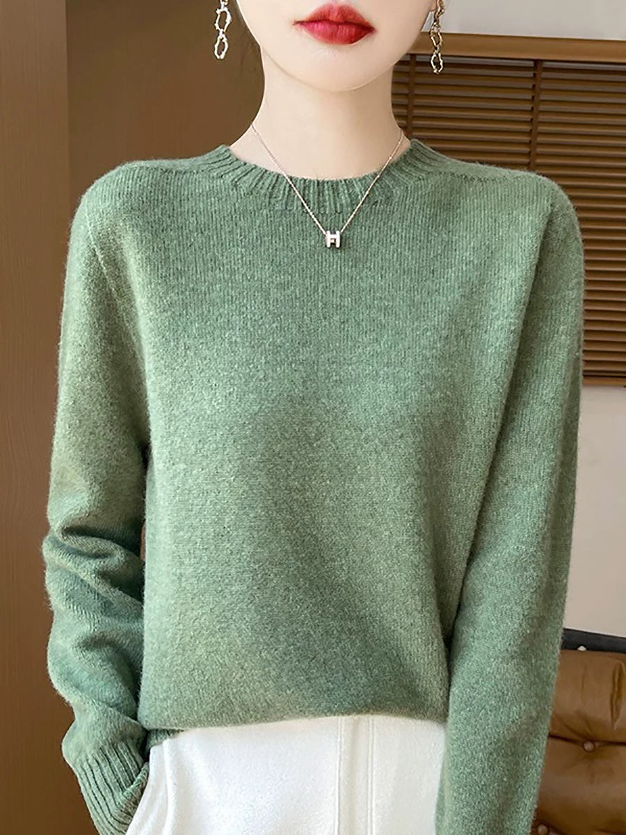 Women Spring Artsy Pure Color O-Neck Wool Sweater