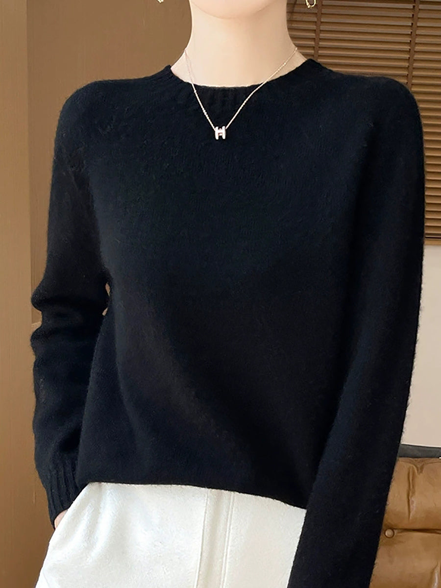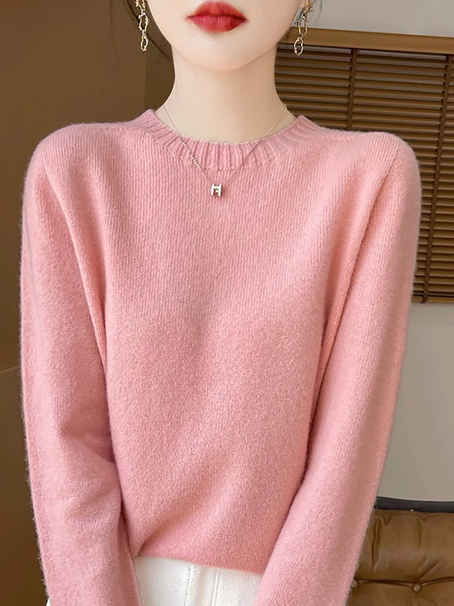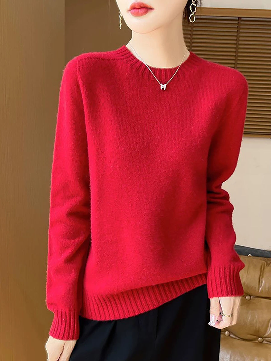 Women Spring Artsy Pure Color O-Neck Wool Sweater
