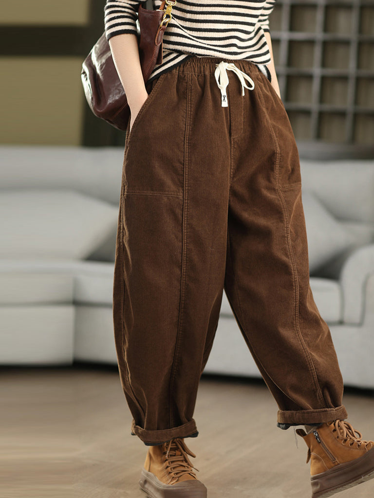 Women Winter Retro Pure Color Corduroy Fleece-lined Harem Pants