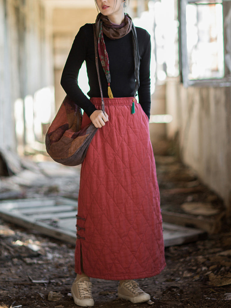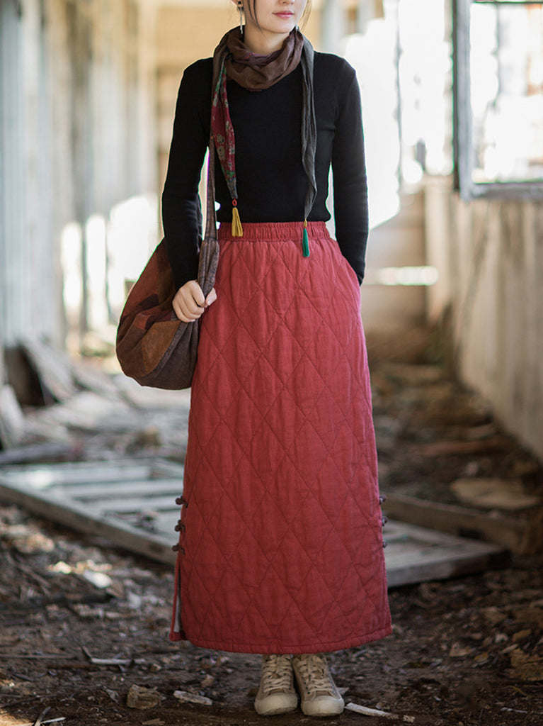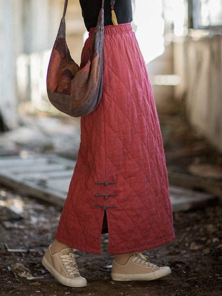 Women Autumn Ethnic Pure Color A-Shape Ramie Padded Skirt