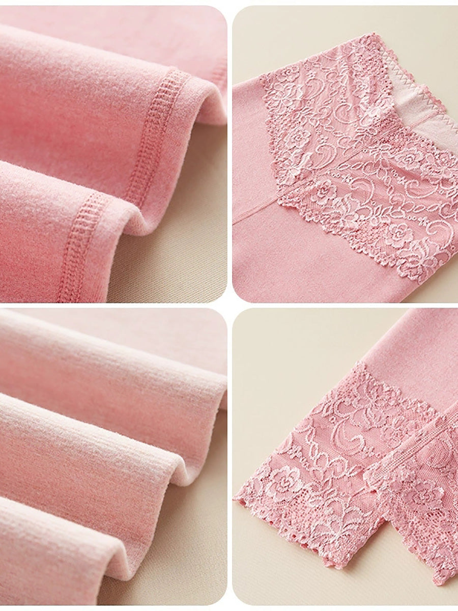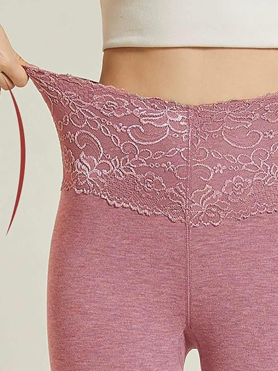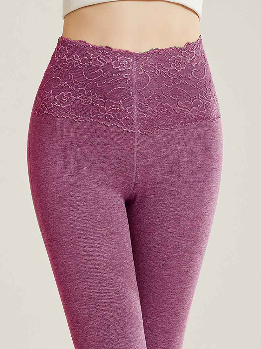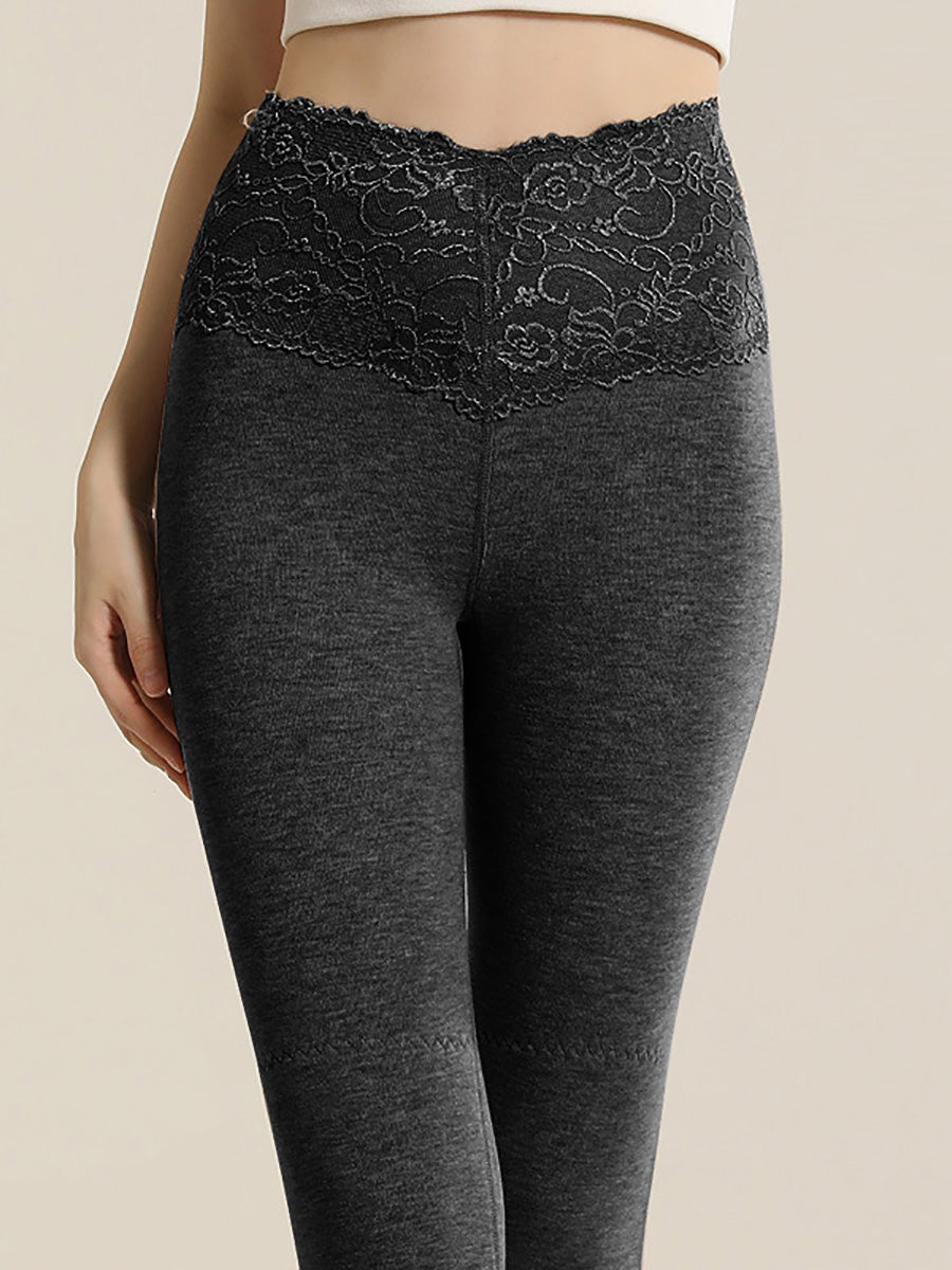 Women Winter Warm Pure Color Lace High Waist Leggings