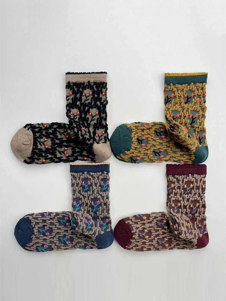 5 Pairs Women Artsy Cherry Jacquard Thick Socks