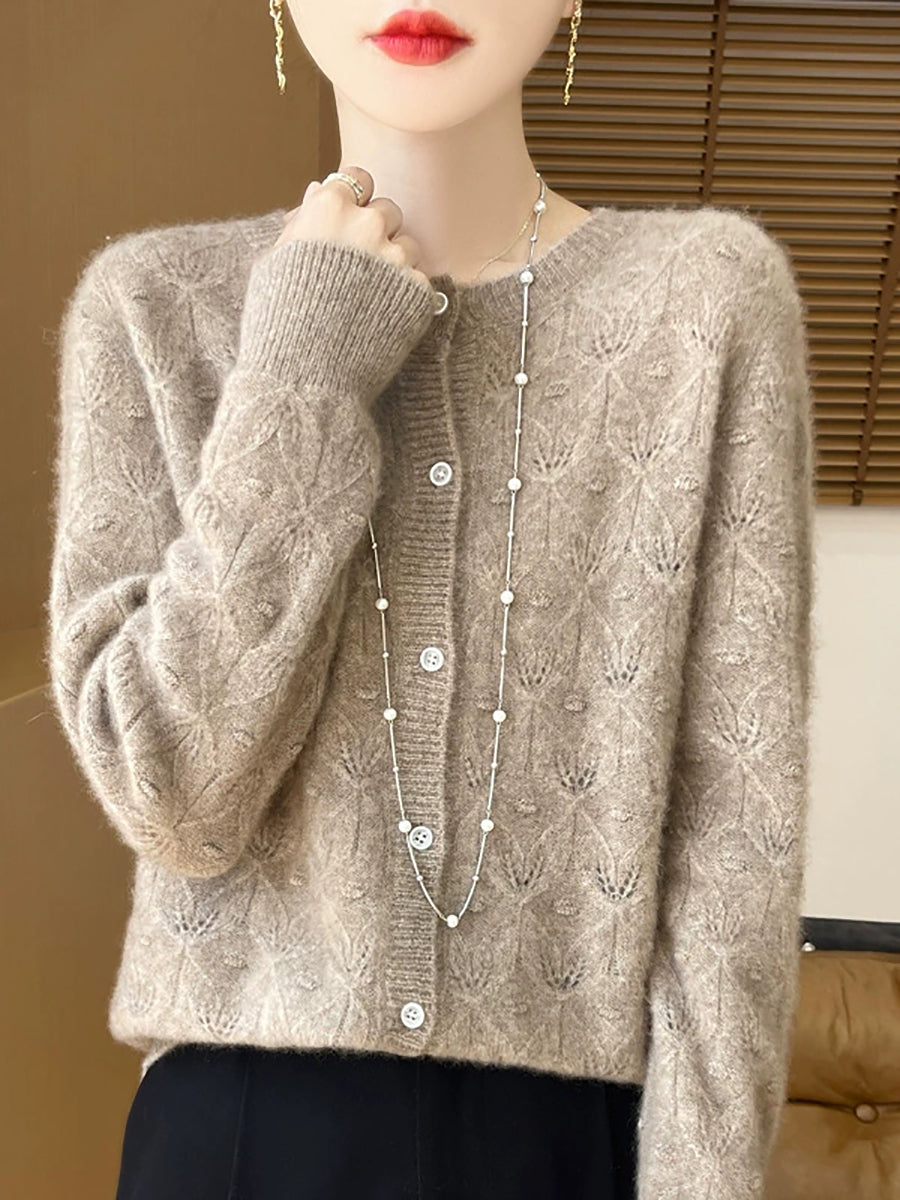 Women Spring Artsy Cable-Knit O-Neck Wool Cardigan Sweater
