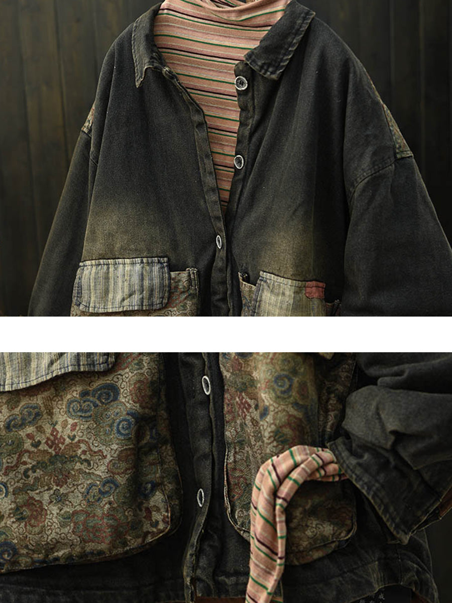 Women Ethnic Flower Denim Spliced Cotton Padded Coat