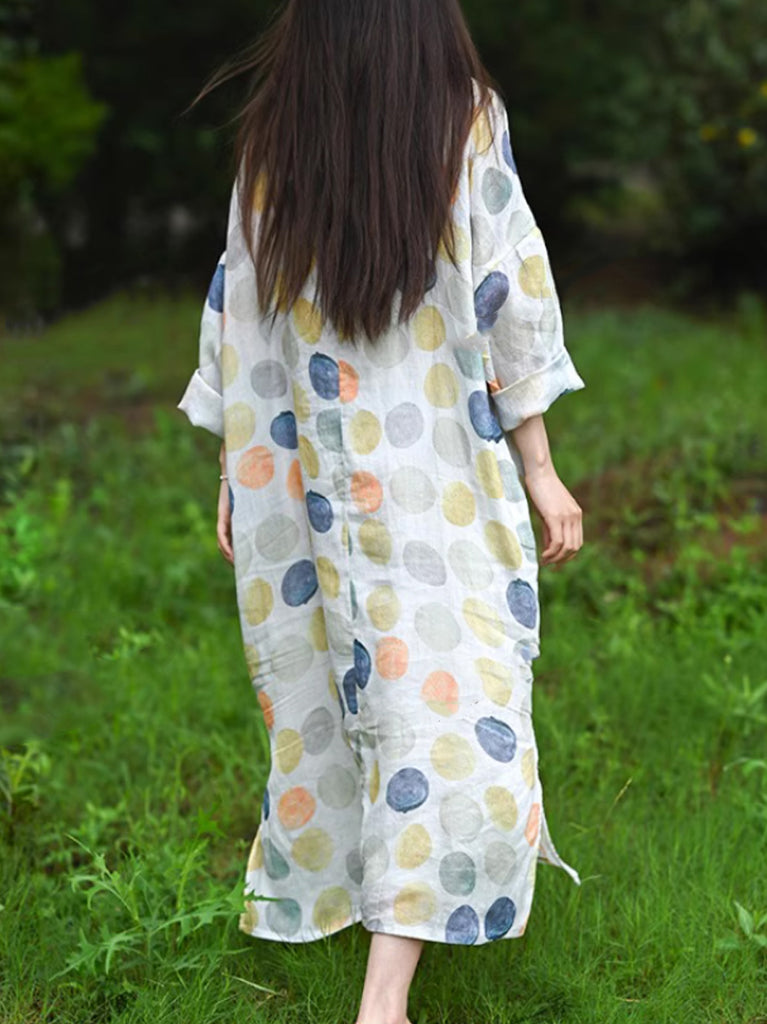 Women Summer Ethnic Colorful Dot 100%Ramie Robe Dress
