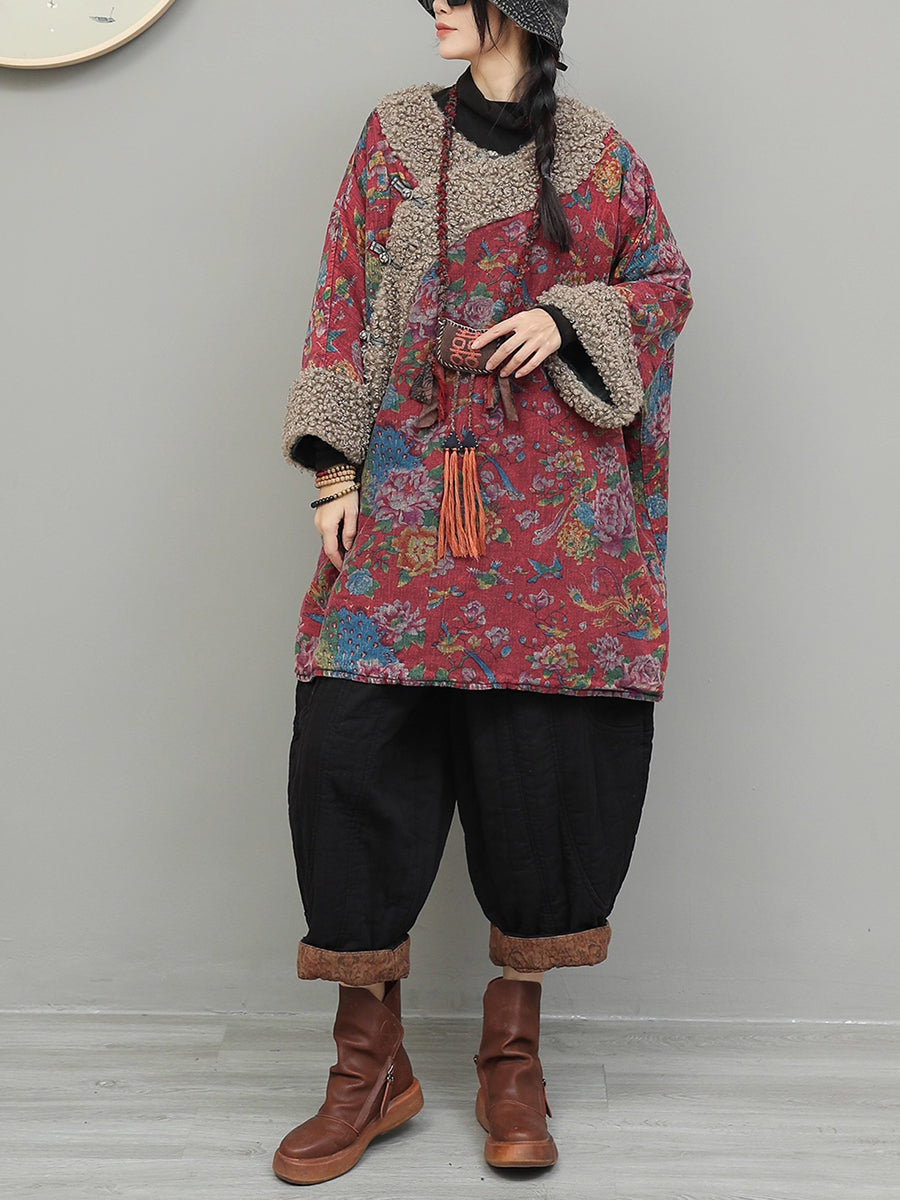 Women Retro Flower Fleece Spliced Cotton O-Neck Coat