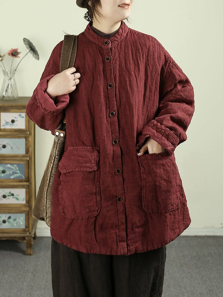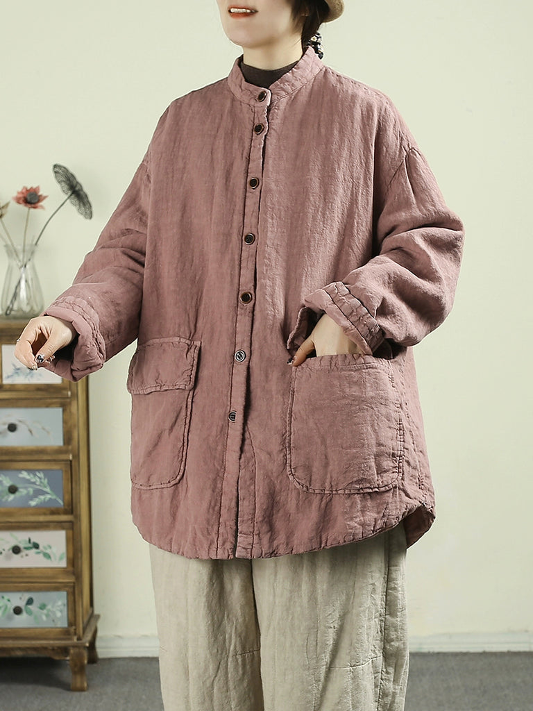 Women Winter Ethnic Pure Color 100%Linen Padded Coat