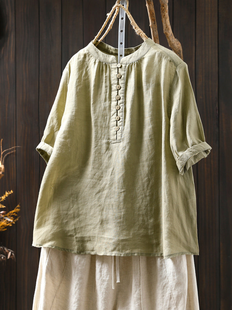 Plus Size Women Summer Pure Color Stand Collar 100%Linen Shirt