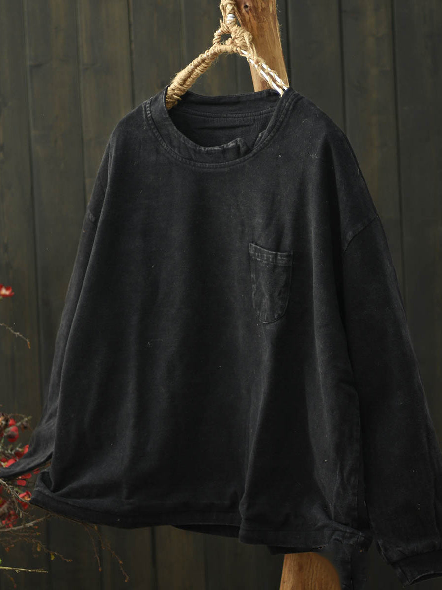 Women Artsy Autumn Pure Color Cotton O-Neck Blouse