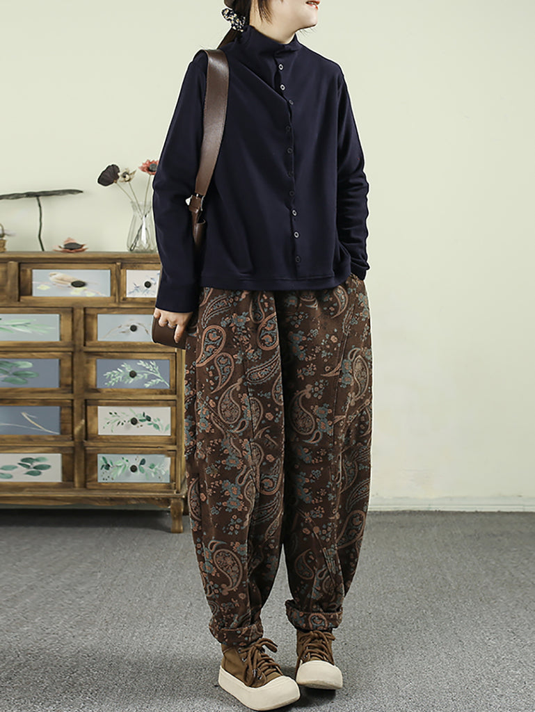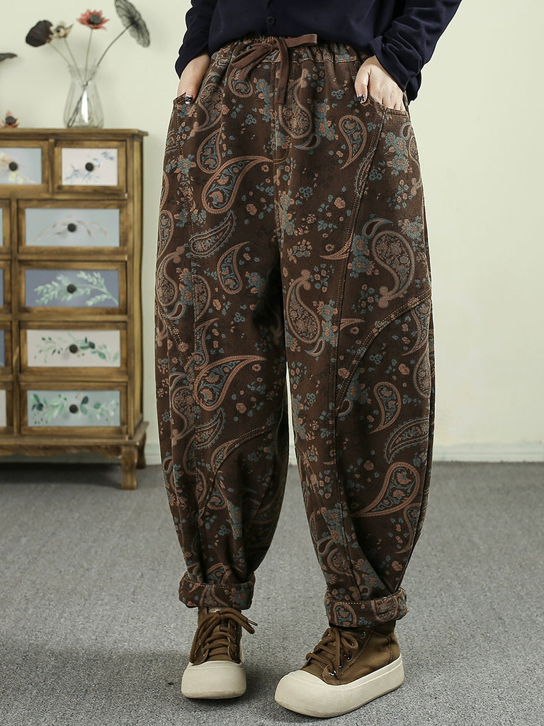 Women Winter Retro Flower Fleece-lined Harem Pants