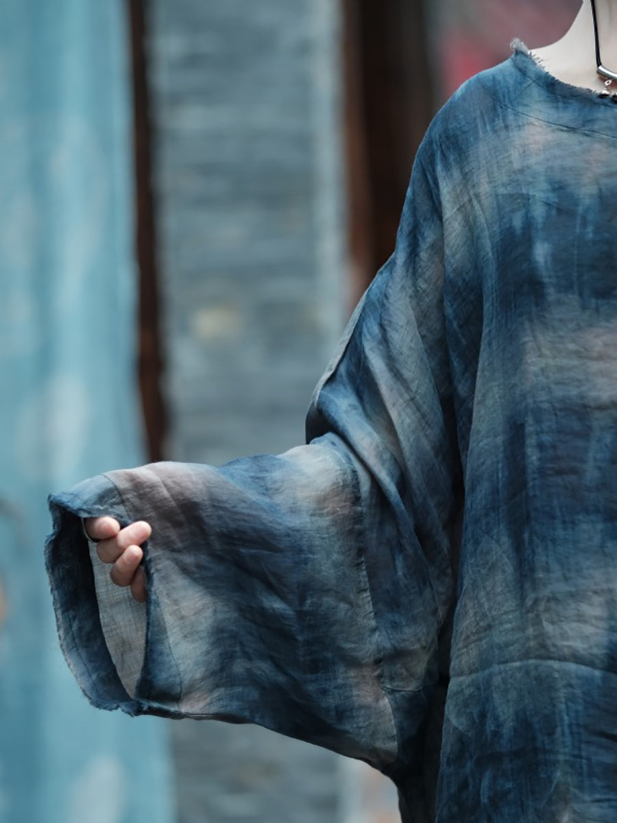 Plus Size Women Summer Retro Print O-Neck Ramie Dress